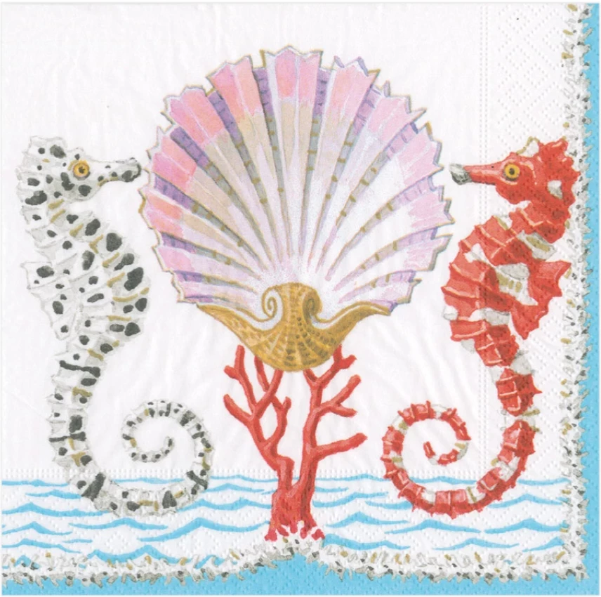 We love this design with the gorgeous seahorses, shell and coral.