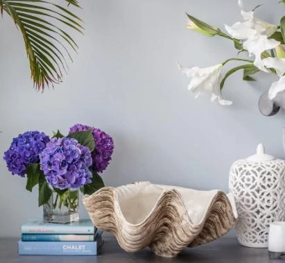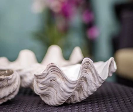 Bring the outdoors inside with natural materials and organic textures. This stone-resin giant clam would make a great unique and thoughtful present. This sculpture encompasses the essence of the ocean, adding a pop of organic life and intrigue to a room. Individually hand-finished, entirely unique. Natural, smooth bone white interior. Textured with natural grooves, brush finished in neutral tones to compliment any individual design.