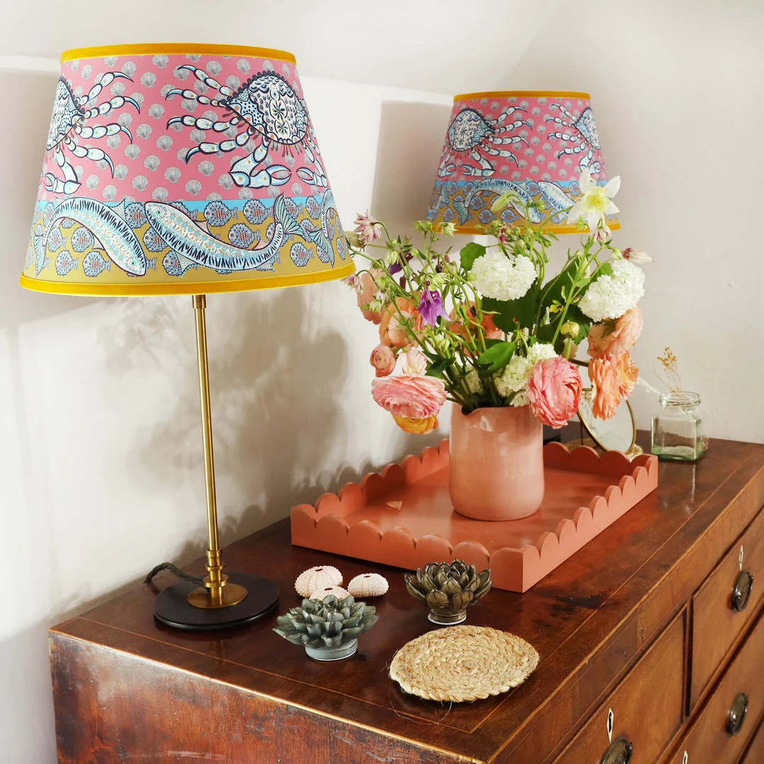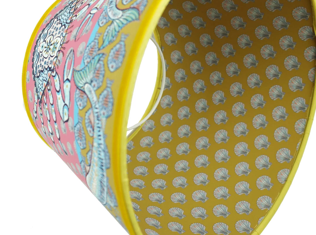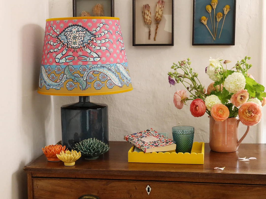 Intricately illustrated crabs sit on a pink background adorned with small scallop shells. A border of fish dance on a background of sun washed yellow bringing the design to life with a gorgeous contrast. Playful, bright and unique, this hand made lampshade instantly brings summer feels into your home.