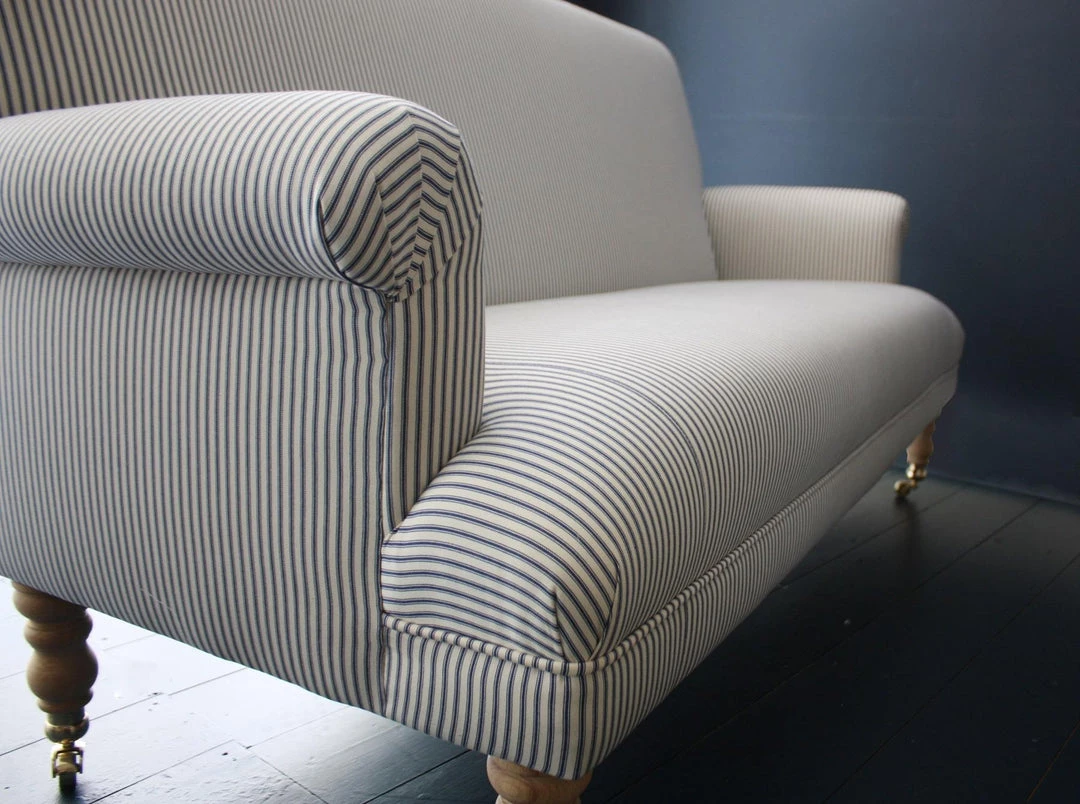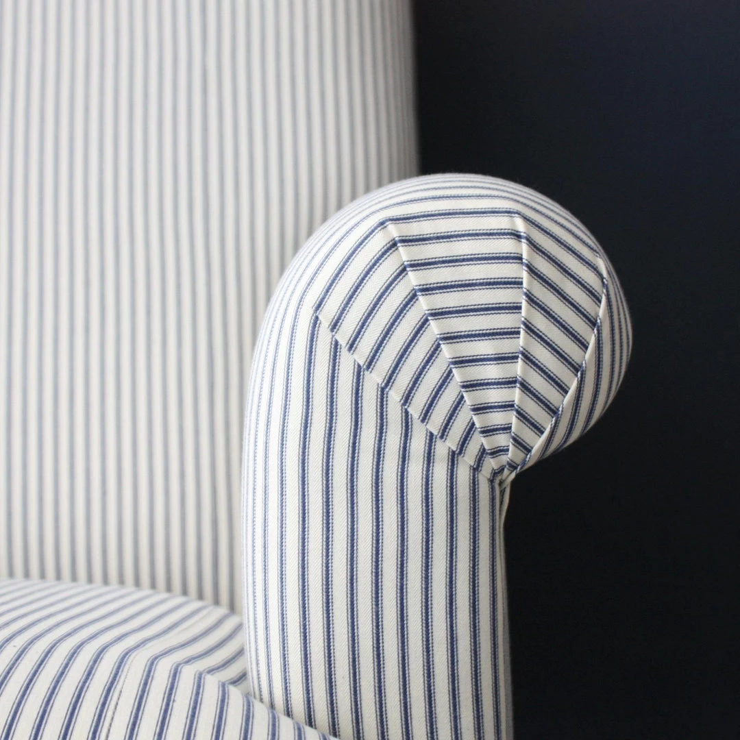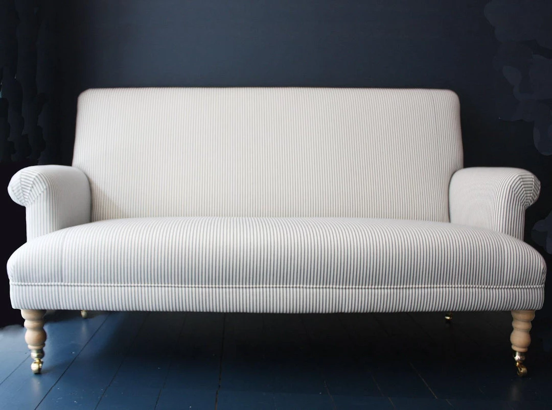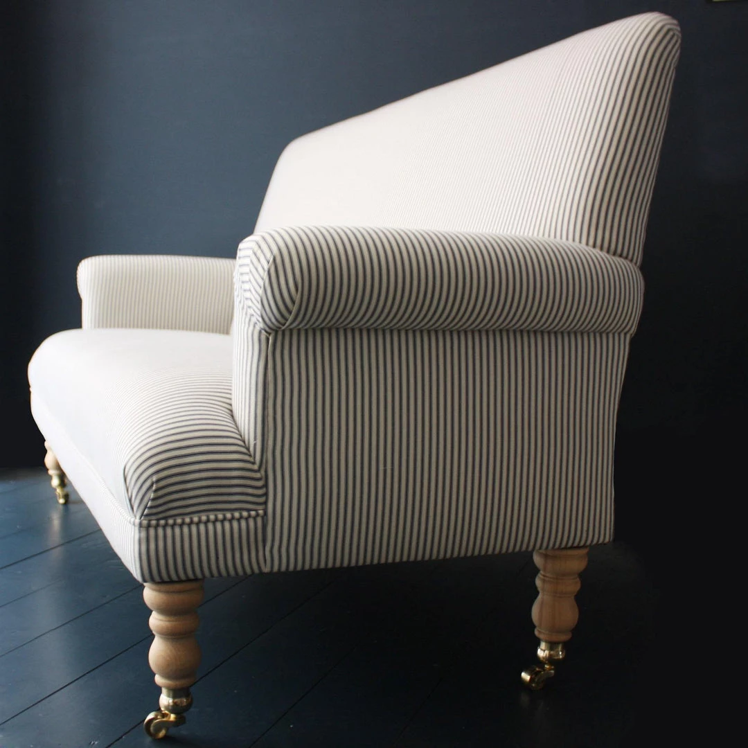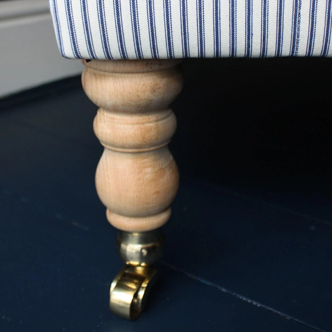 This is a classic piece hand made for us locally. Upholstered in a classic blue and off white ticking stripe, it’s perfect for your coastal home. We’ve chosen oak legs with a classic castor and they have been hand waxed to give them a beautiful sheen.