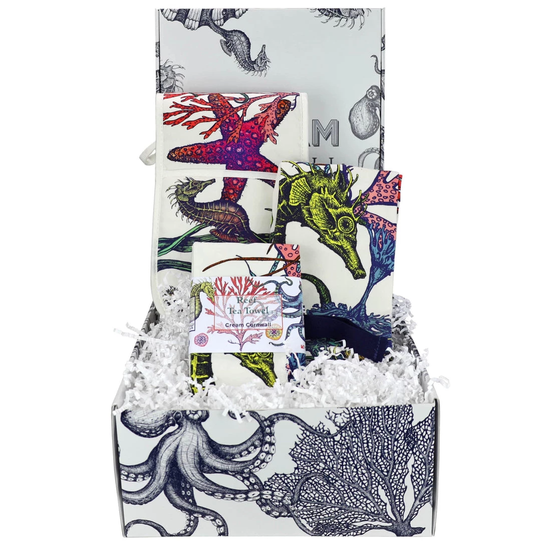 Our Chef’s gift hamper is the perfect gift for anyone who loves being in the kitchen. Who can resist our beautiful reef collection of kitchen linens. In this gorgeous gift box, we’ve put one of our Reef oven gloves, made to EU standards so super thick, an Apron which is an absolute show stopper and a tea towel, almost too good to use!