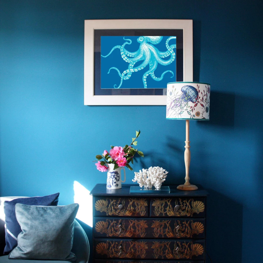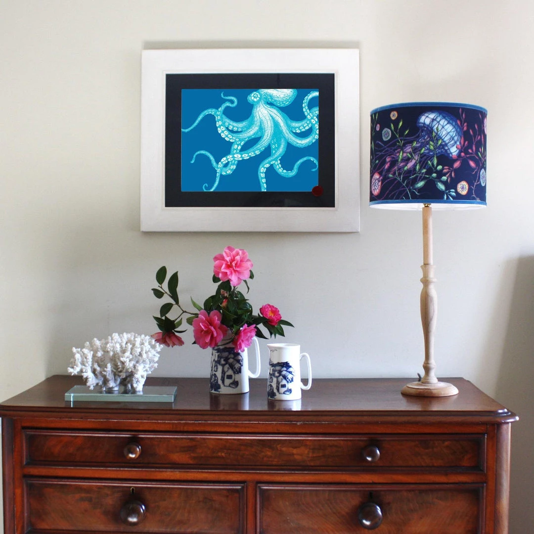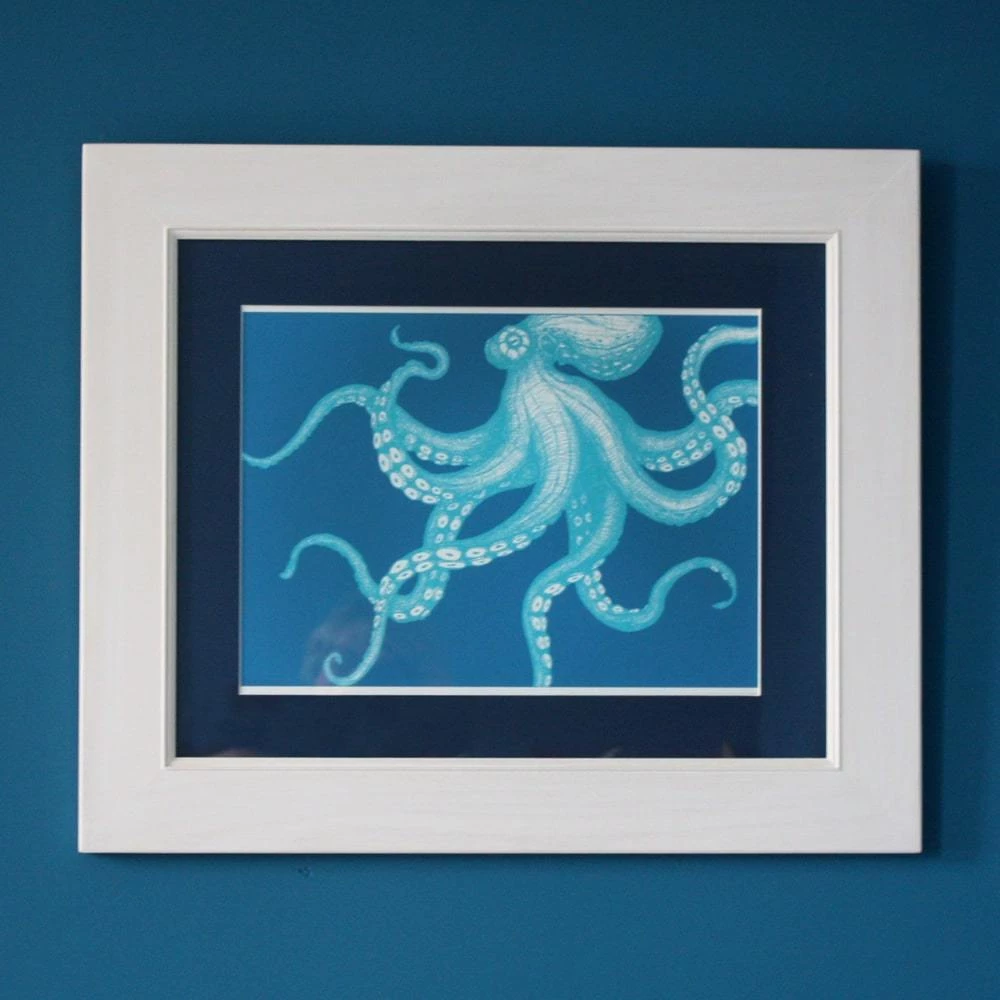 Our Octopus print is one of our most popular designs, with its tentacles dancing across the paper. We’ve given it a pop of colour with a turquoise Octopus on a beautiful blue background.