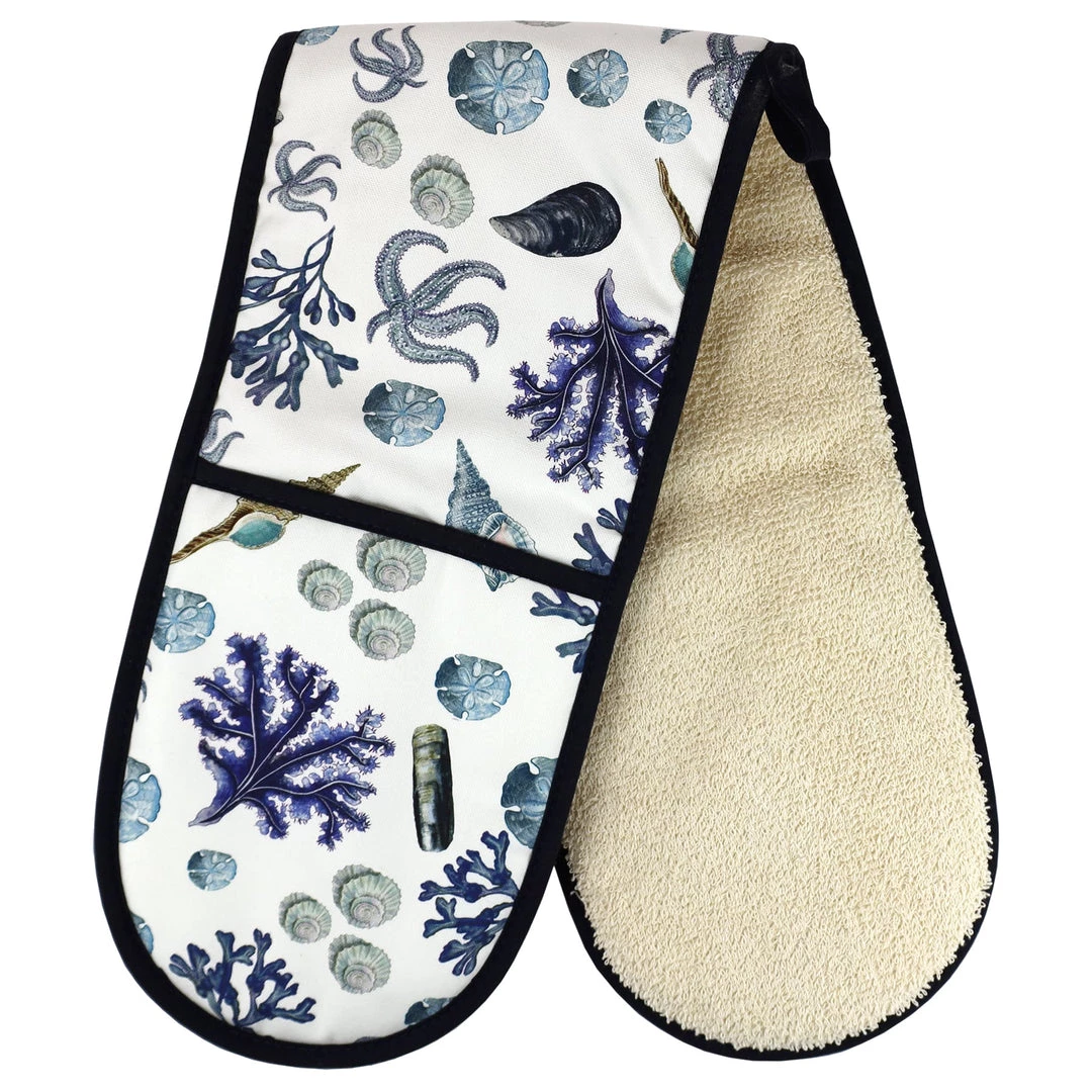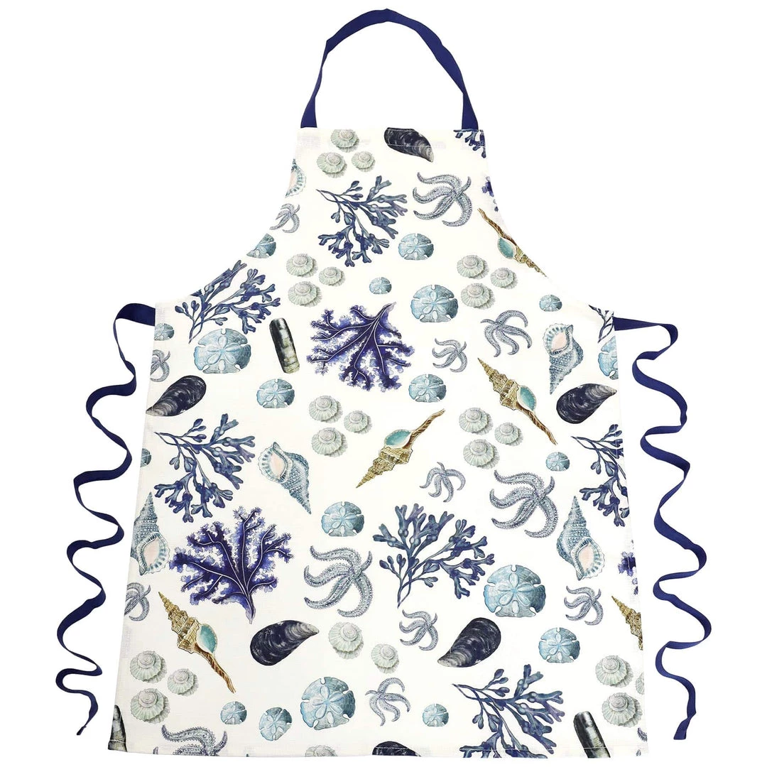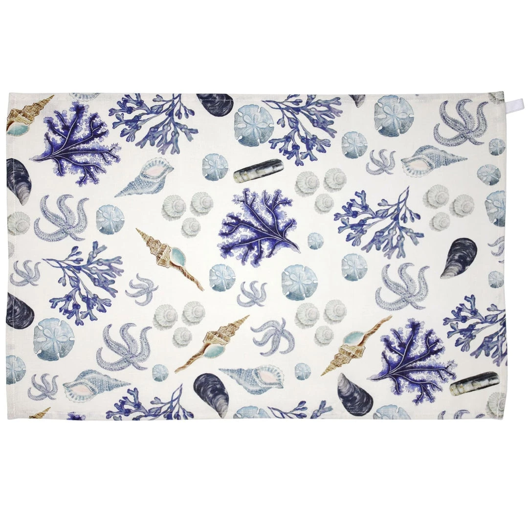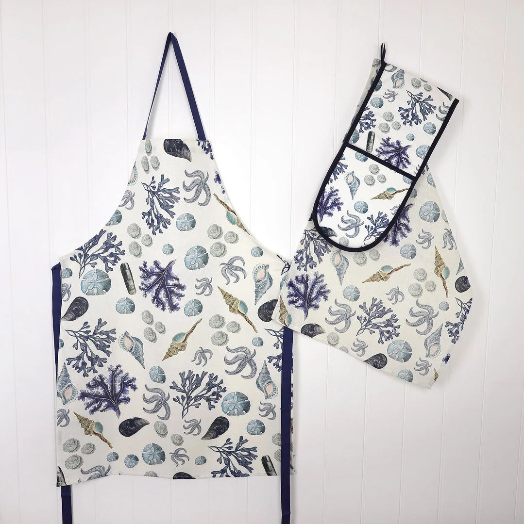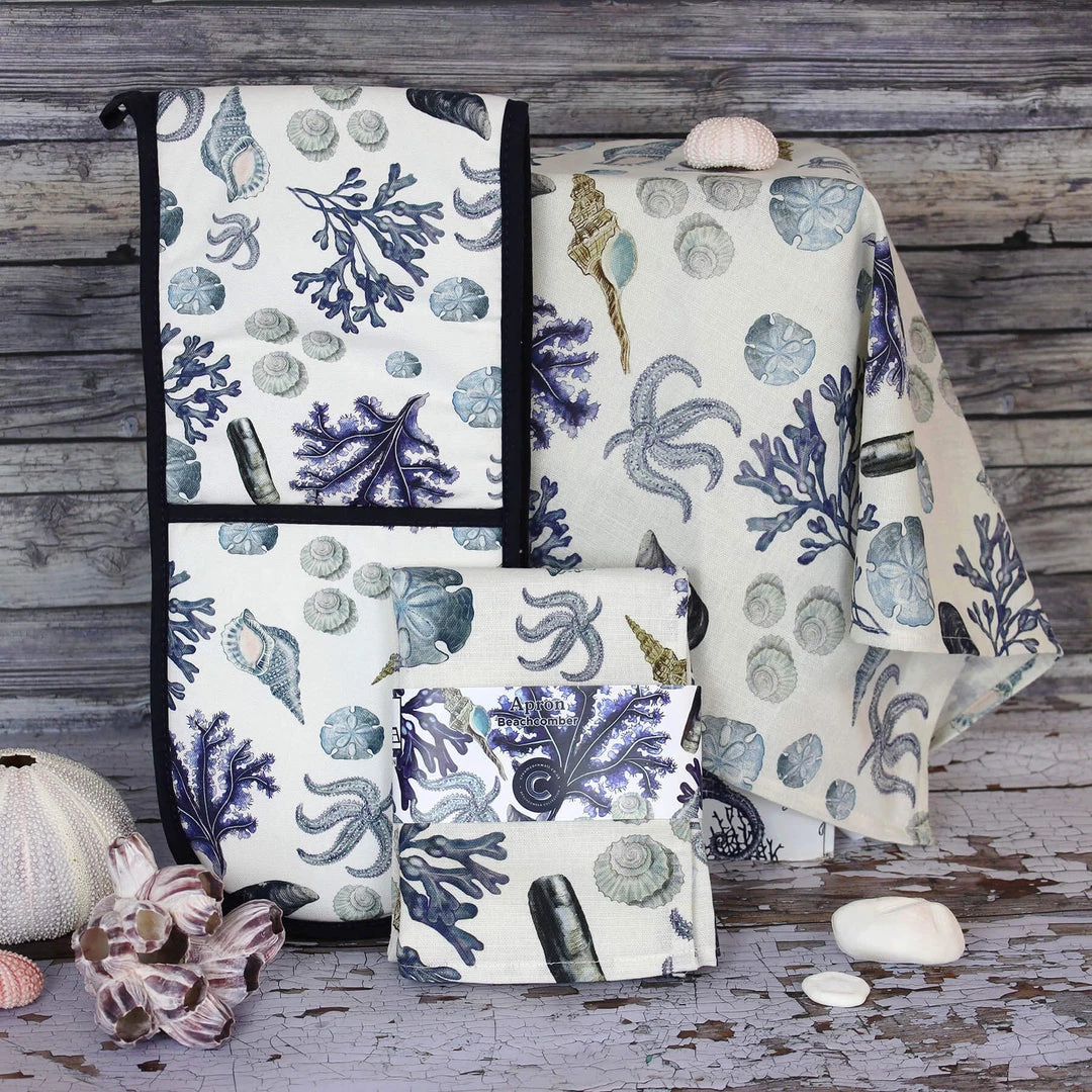 Our Beachcomber design is the perfect linen set to refresh a kitchen space and add a touch of coastal fun to any kitchen. Inspired by the treasures that wash up on the shoreline, this beautiful, quality linen will remind you of happy days exploring the coast. The Beachcomber design is adorned with an array of different shells that sit against a beautiful fan of indigo seaweed. It has shades of blue, from deep washy indigos, silver greys, through to sky blues with a pop of soft pink. Not only is the linen practical, but the pieces make a great talking point as you dish up a meal.