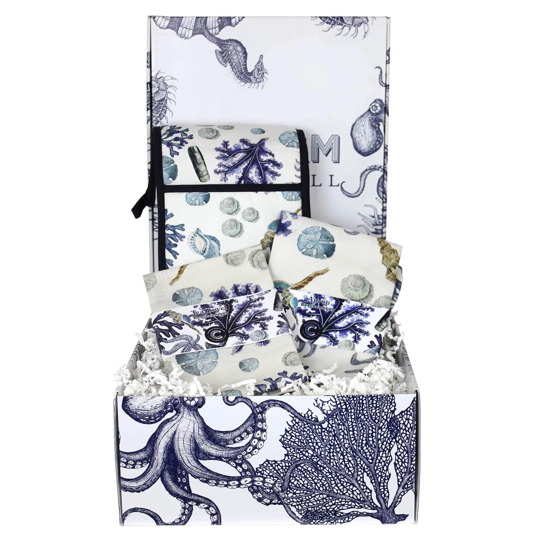 This distinctive blue and white hamper box holds the most delightful treats; unique gifts that are destined to please. Let your eyes feast on the beautifully packaged Beachcomber apron, oven gloves and tea towel; and be delighted by the smile of the loved one receiving the hamper.