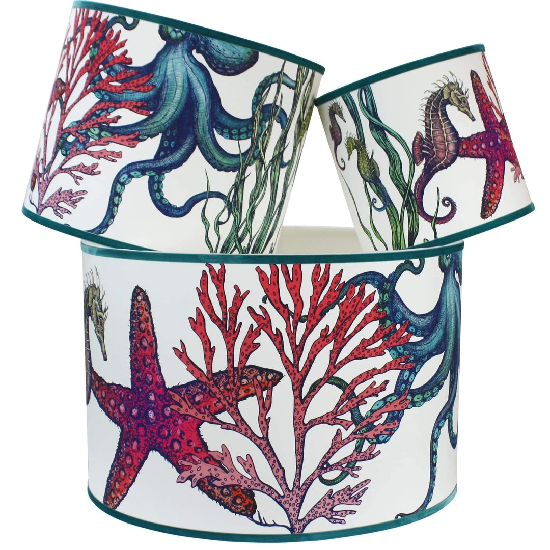 Our Rainbow lampshades take our iconic and most popular designs, the octopus, seahorse and starfish and brings them to life in a multi coloured under water rainbow inspired by the amazing colours of coral reefs. The colours really pop on this inky blue background, you can almost imagine you’re underwater. Read about the inspiration for our Reef collection here.