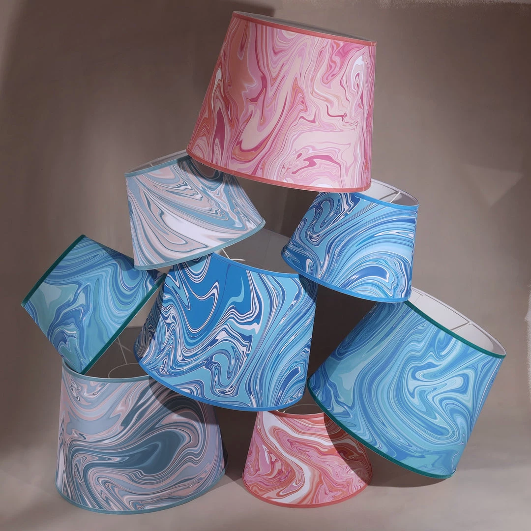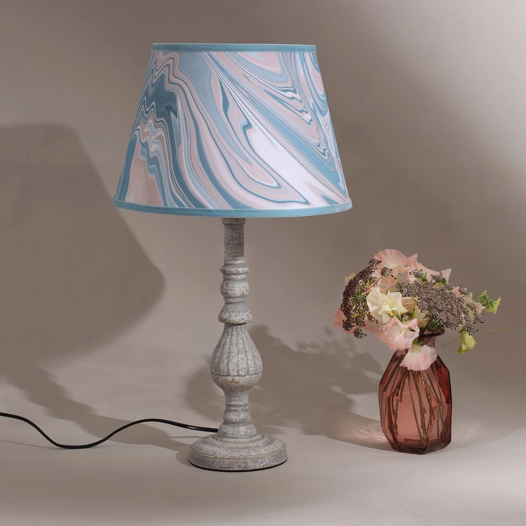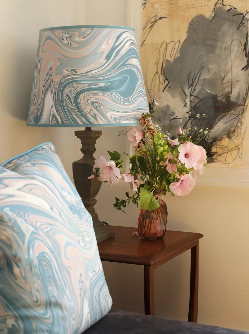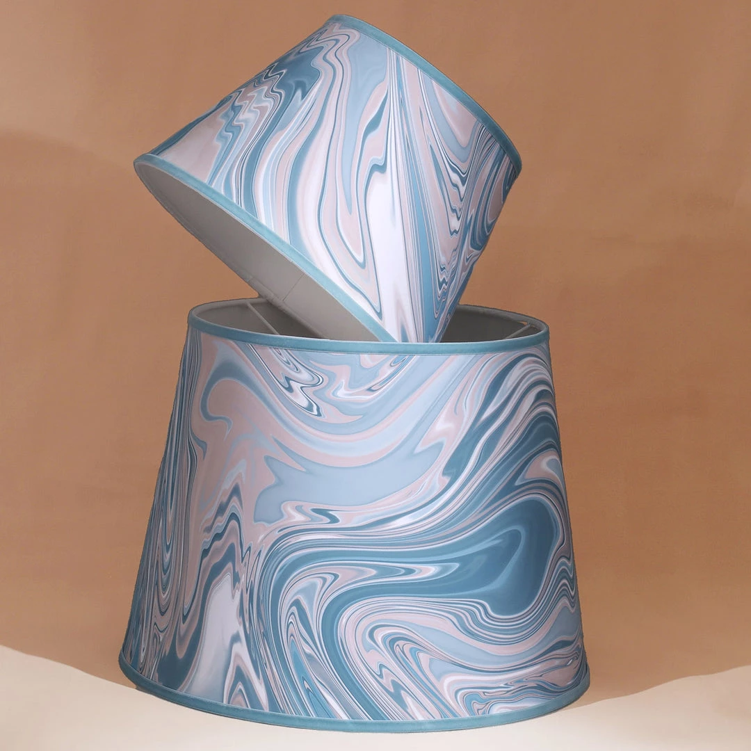 Our Ripple lampshade reminds us of a slow, peaceful creek where time stands still. It features a gorgeous marble pattern that uniquely captures the beautiful sense of movement between swirling muted blue and earth tones. A light blue velvet trim complements the shade perfectly. Completely unique, this hand made lampshade instantly makes a statement in your home.