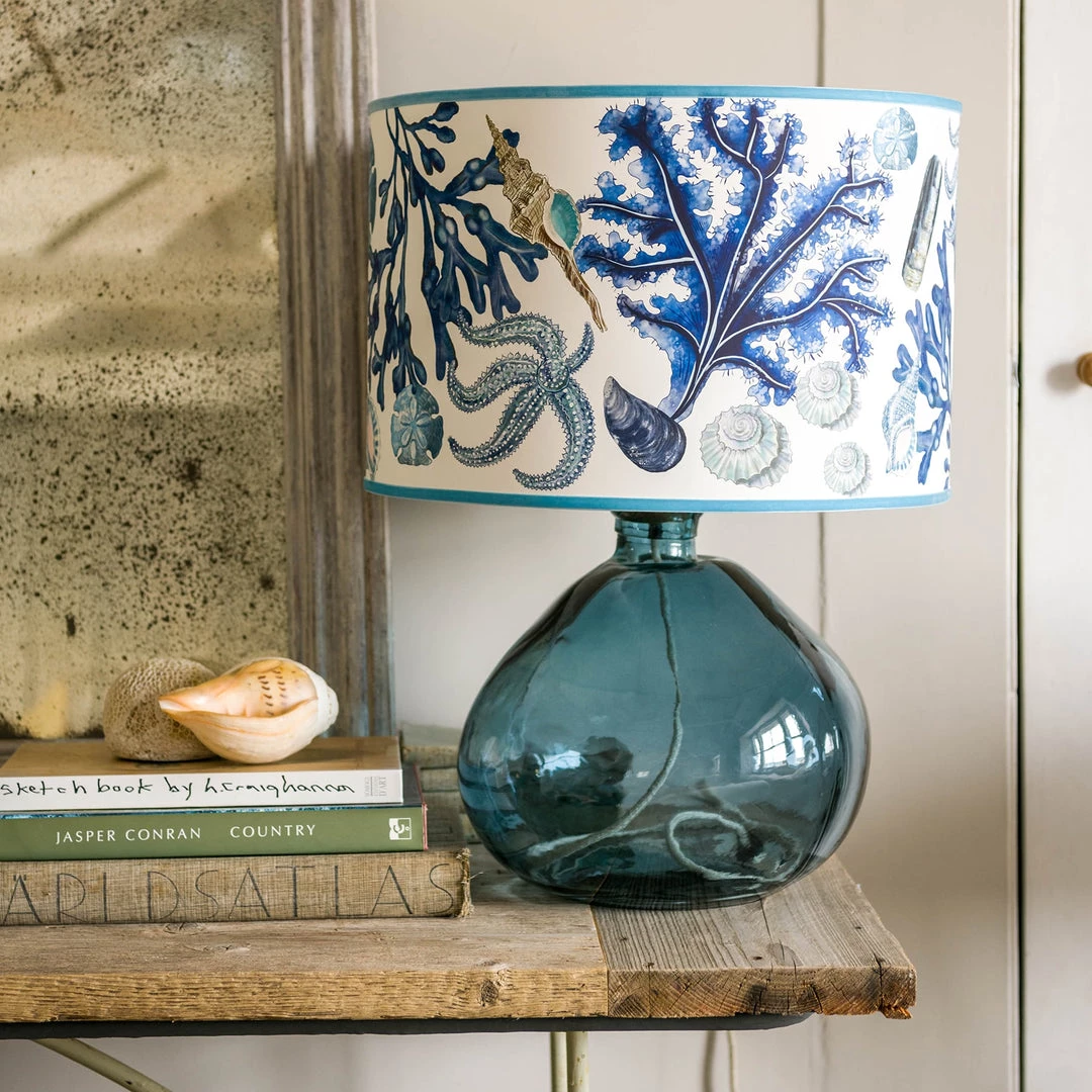 Razor clams, mussel shells, winkles and a whelk shell sit against a beautiful fan of indigo seaweed. It has shades of blue, from deep washy indigos, silver greys, through to sky blues with a pop of soft pink, this collection of shells reminds me of a Cornish summer. Choose from two base colours, ink blue or off white for this beautiful lampshade.