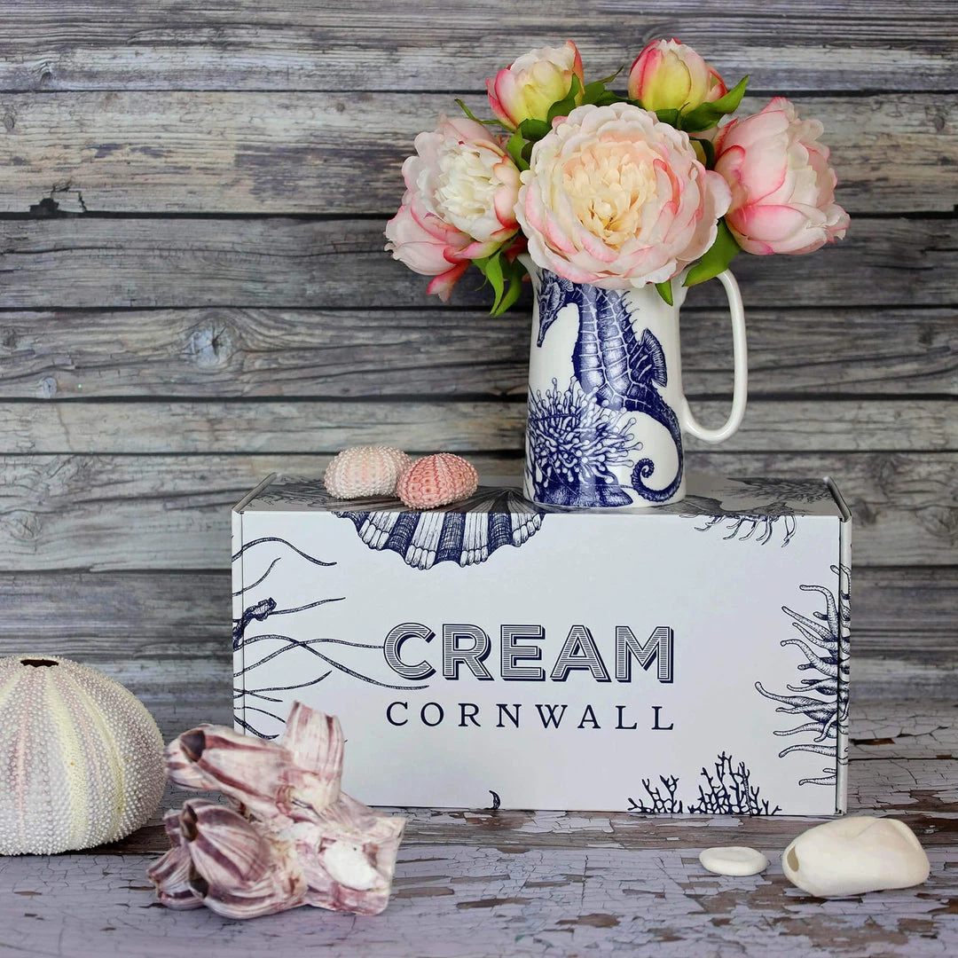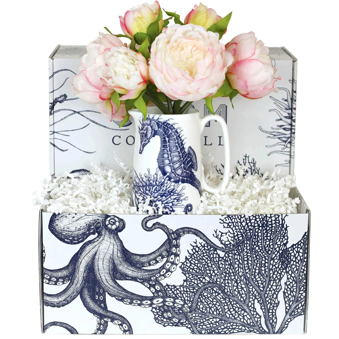 Our bone china Seahorse jug features a striking hand-drawn illustration of this beautiful sea creature swimming amongst fan coral, anemones, and the classic scallop shell creates a beautiful underwater ocean scene. Add the gorgeous bouquet of light pink peonies and you have a perfectly styled flower arrangement with the realistic blooms allowing you to enjoy your peonies all year round.