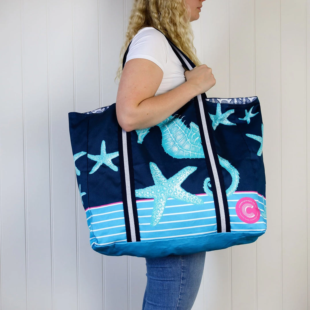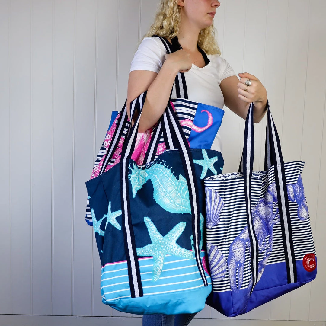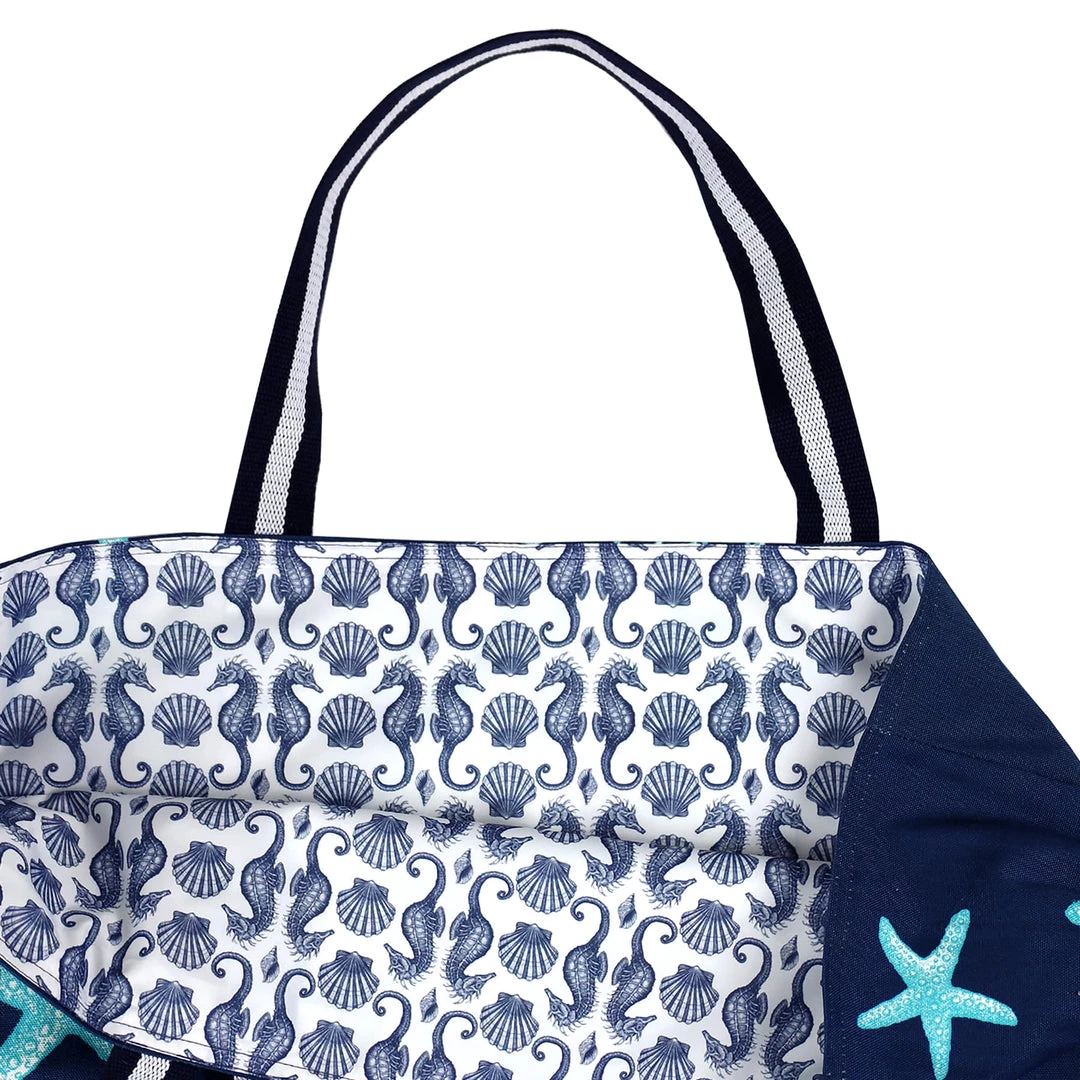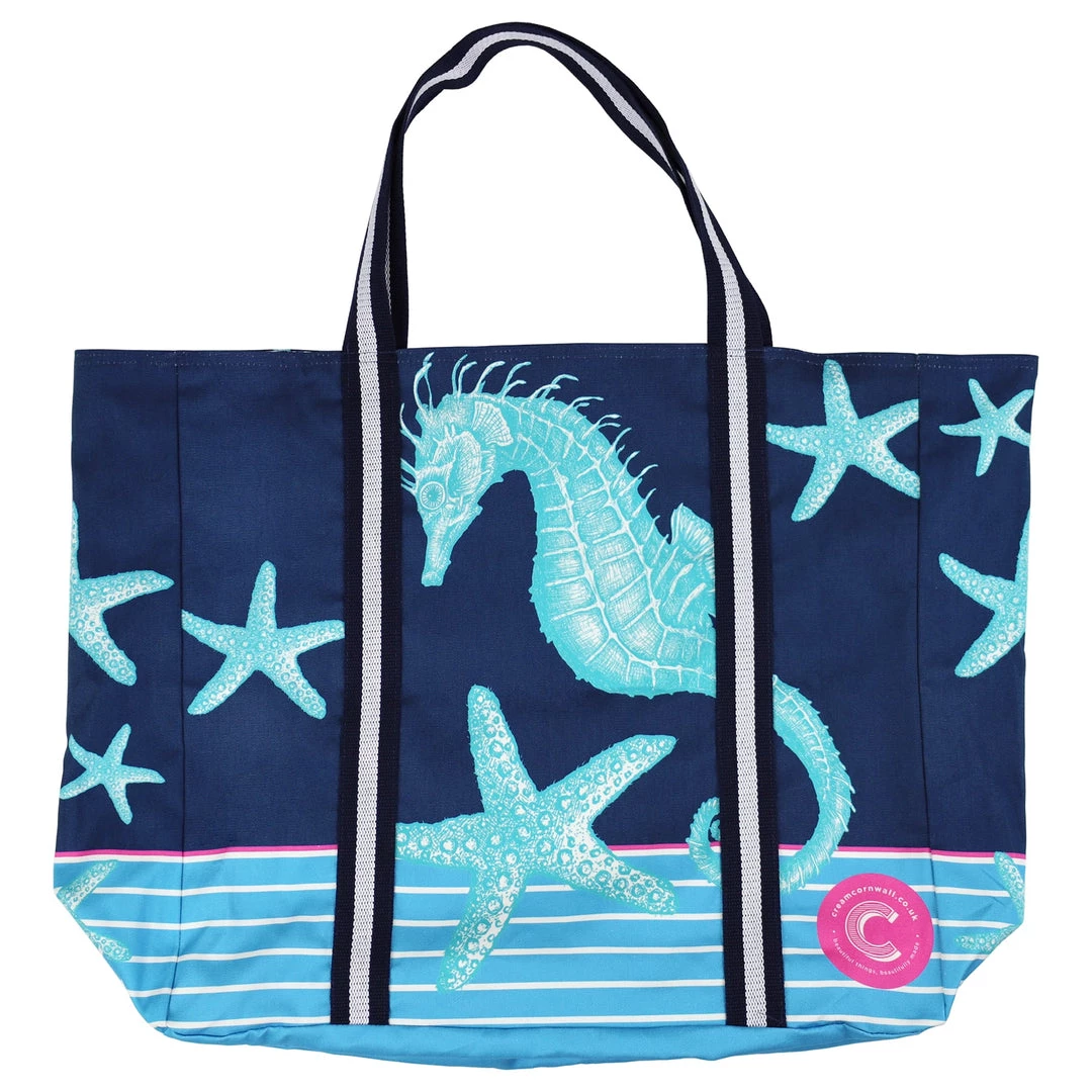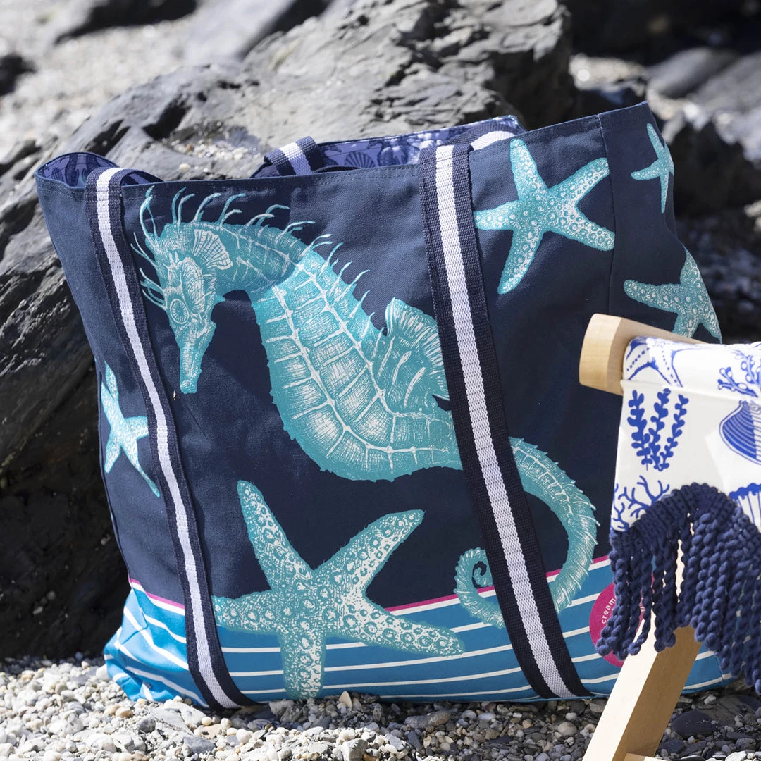 - Design: Aqua seahorse with navy mini seahorse and shell lining