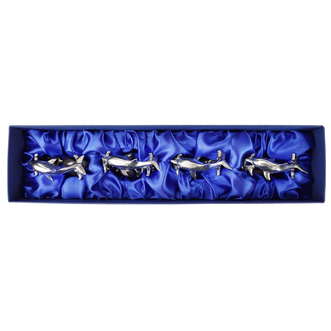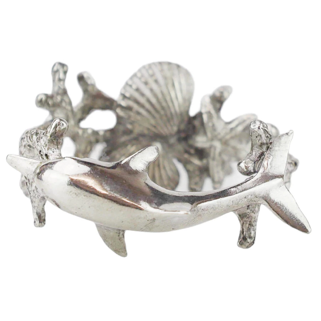 - Description: Set of four napkin rings with dolphin and coral design