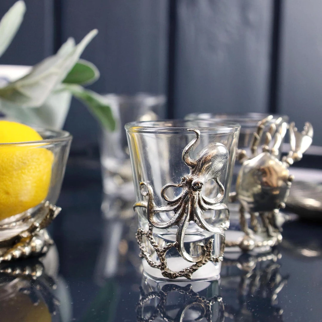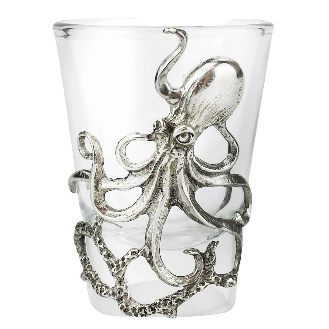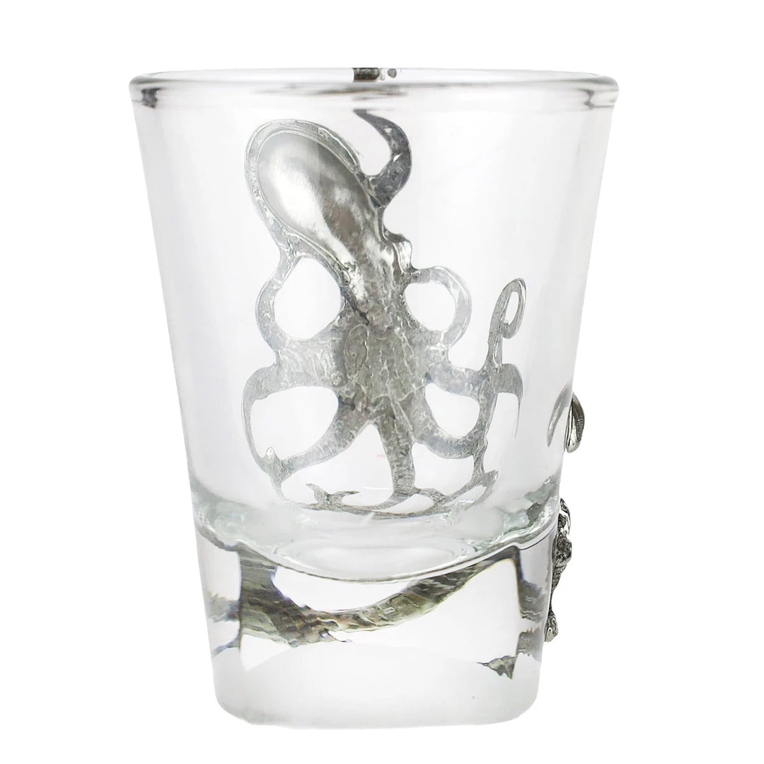 - Description: Shot glass with pewter octopus design