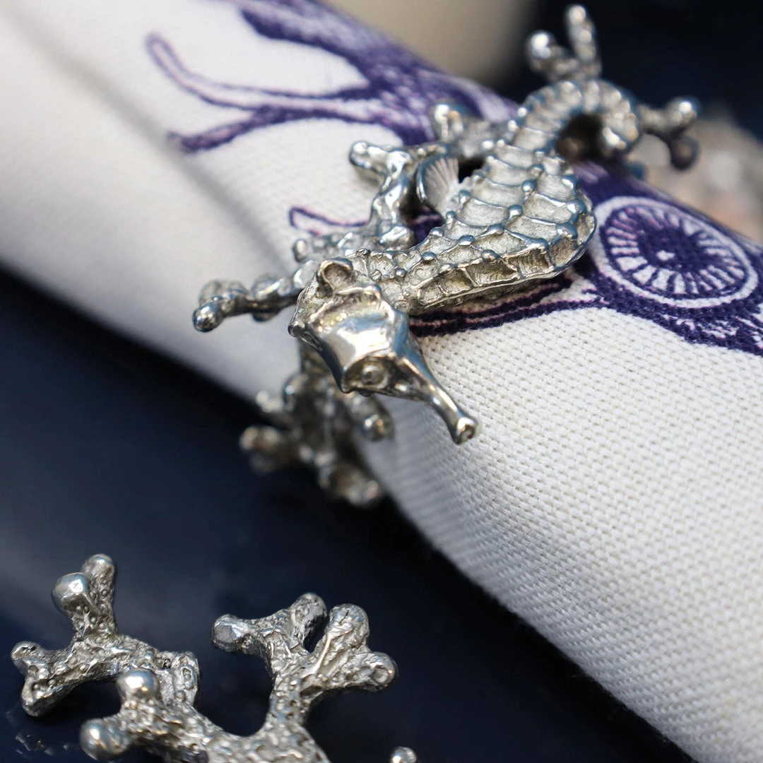 This set includes four gorgeous seahorse napkin rings. With the seahorse wrapped around at the front and an arrangement of starfish and coral at the back, these will look beautiful on the dining table.Â