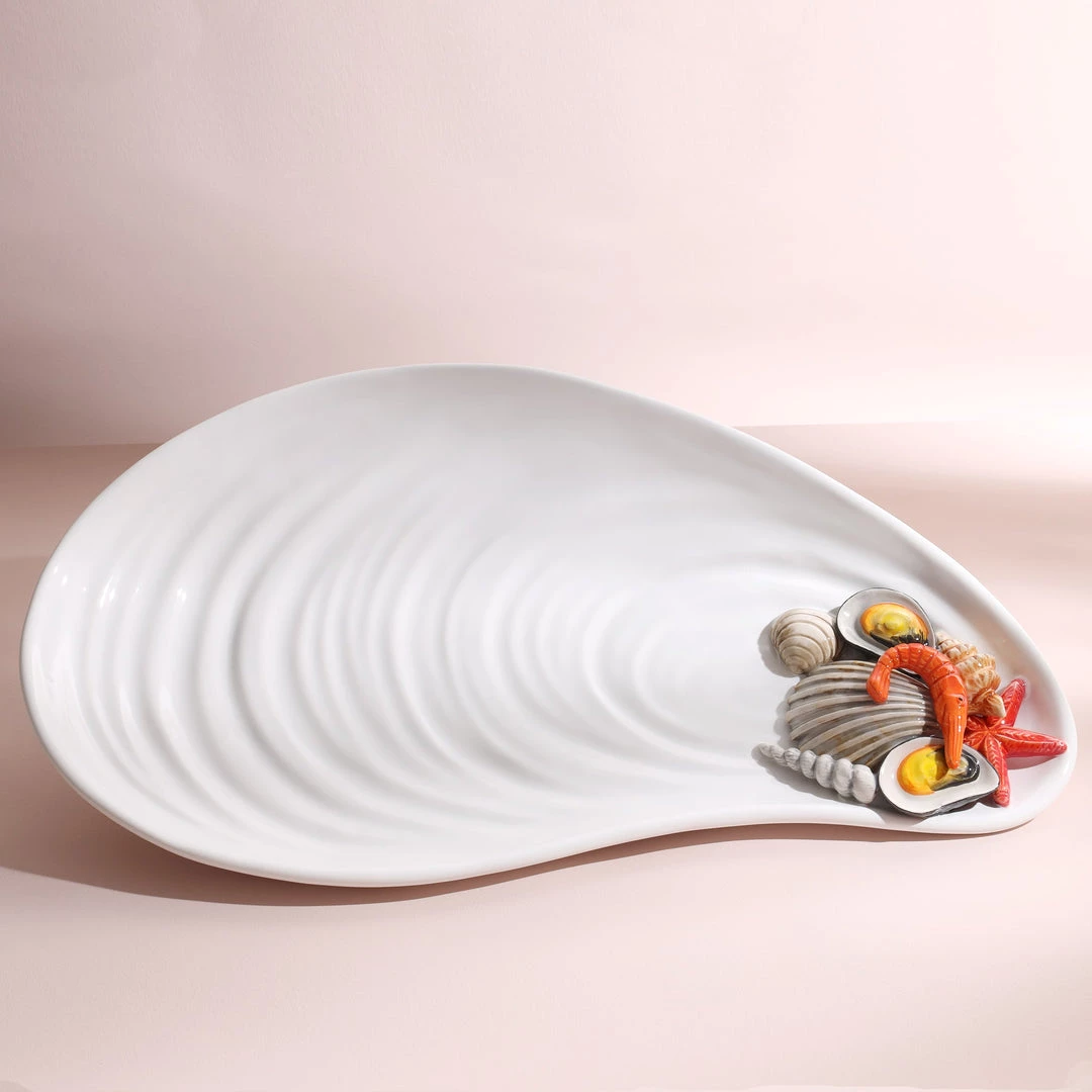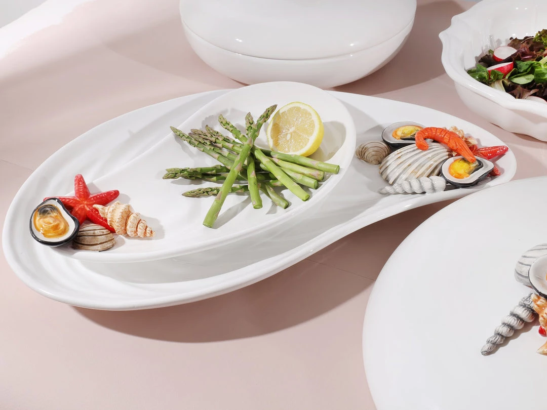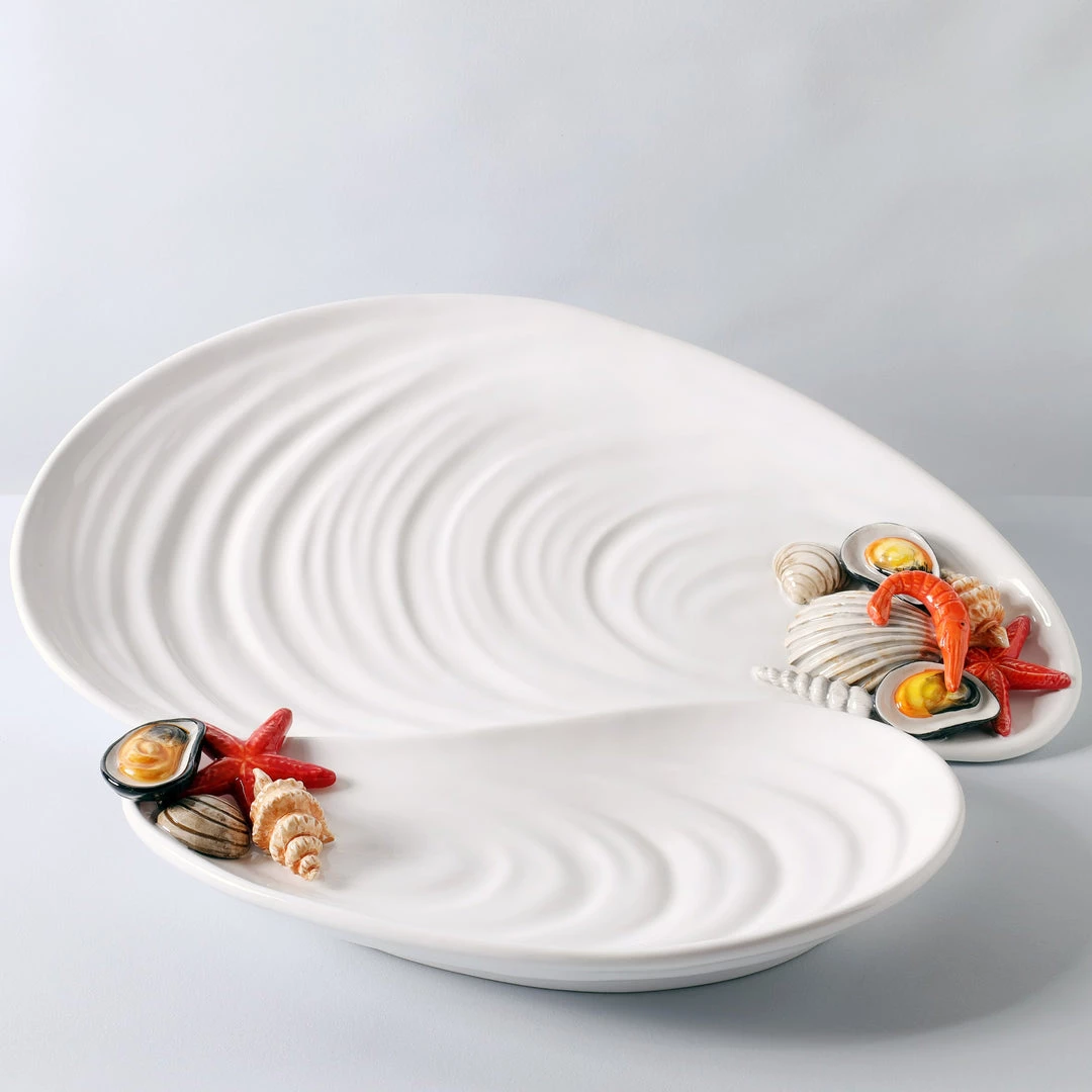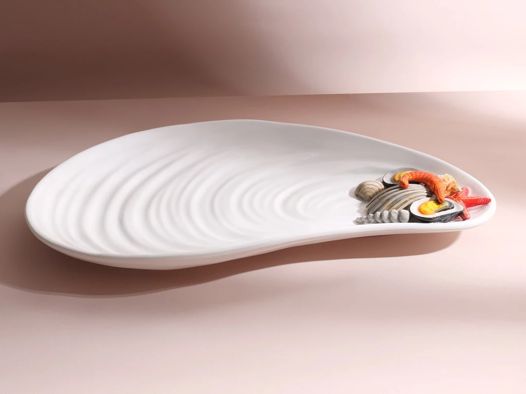 This crisp white tray in the shape of a mussel is a must have. Adorned with coloured ceramic shells and textured like a mussel, this ceramic piece is versatile in its use. Whether making an ornamental statement or putting it to use at the table, this piece is sure to be a beautiful addition to your collection.