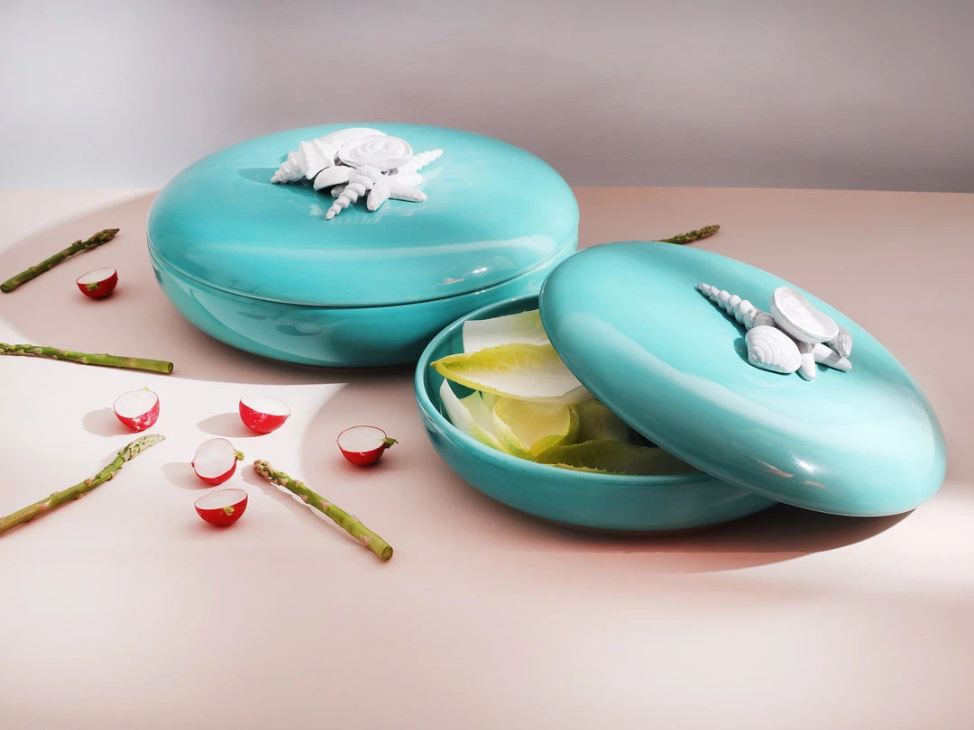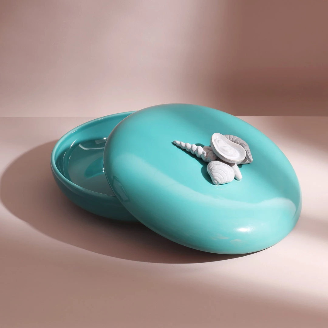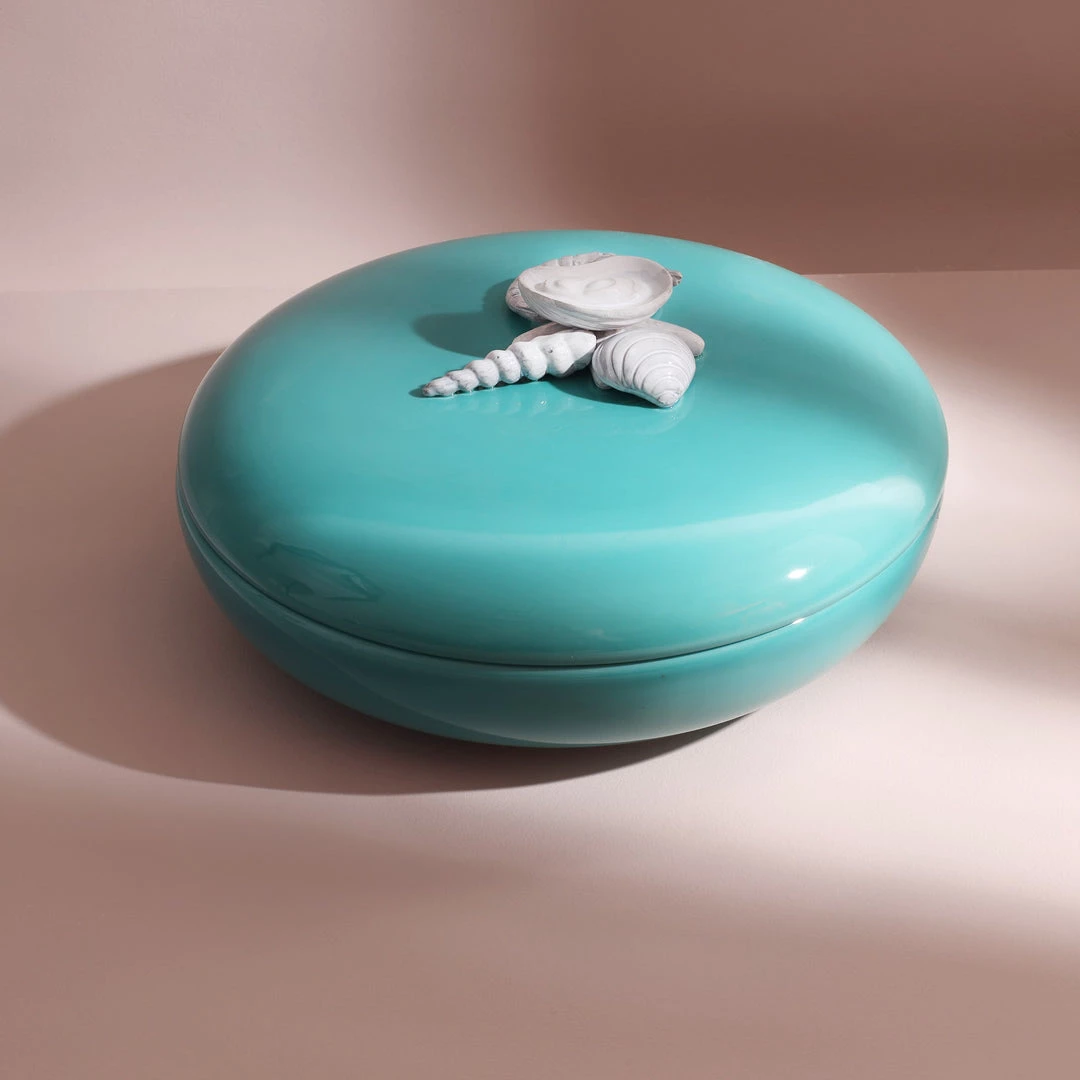 This beautiful medium sized aqua blue box is the perfect place to hold your treasures. The lid is decorated with gorgeously detailed ceramic shells, making it an ornamental feature in any room.