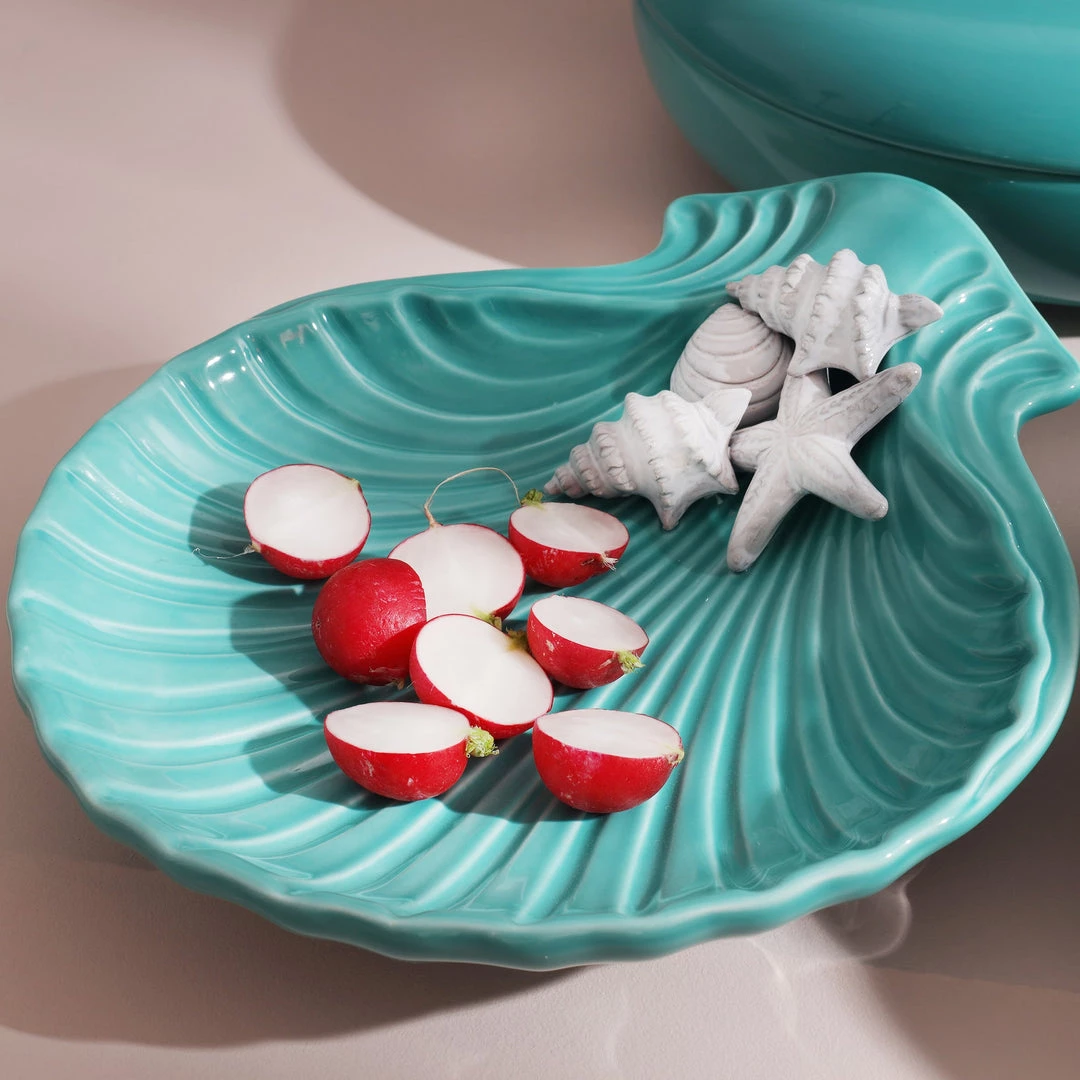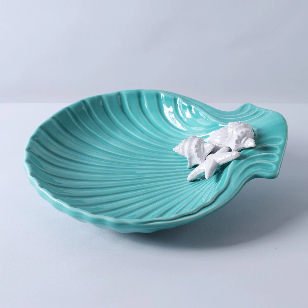 This absolutely gorgeous aqua blue scallop shell plate is adorned with intricate ceramic shells and is one of those unique pieces that gets everyone talking. Whether used as a decorative piece or as part of your dinner service, it’ll make a beautiful statement.