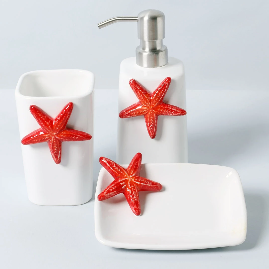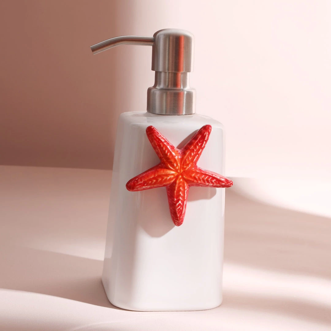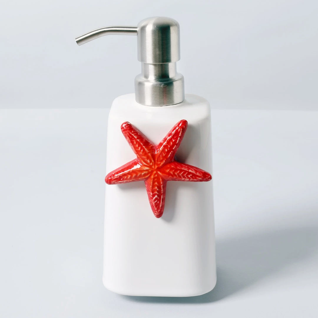 Bring that calming coastal style into the smallest rooms with this gorgeous white ceramic soap dispenser. Adorned on the front with a intricate red starfish, this beautiful piece makes a statement.