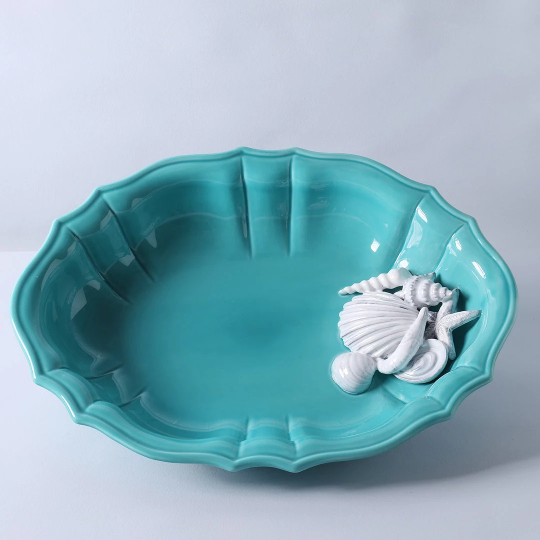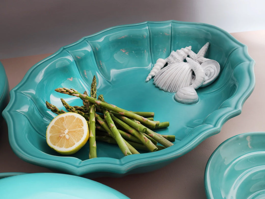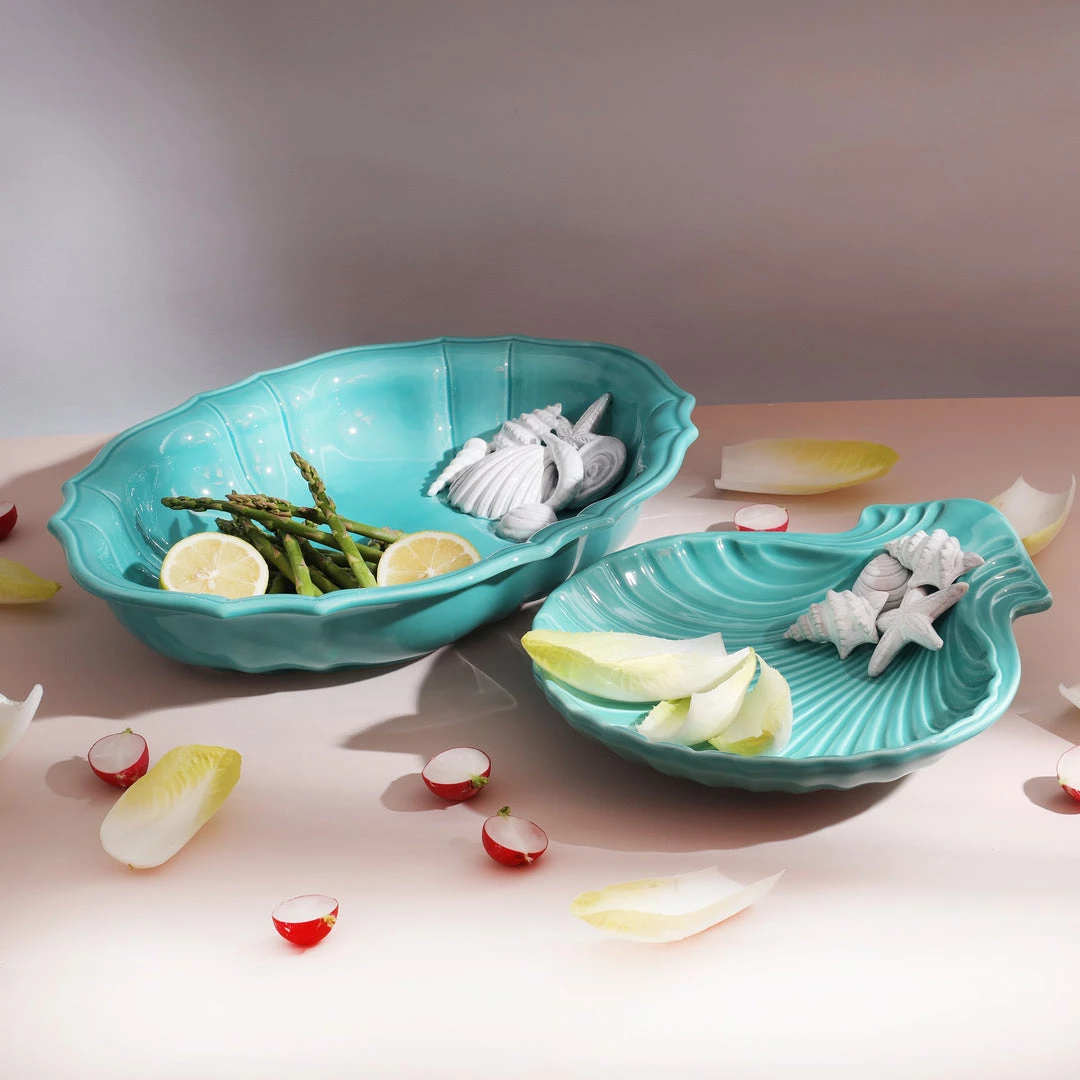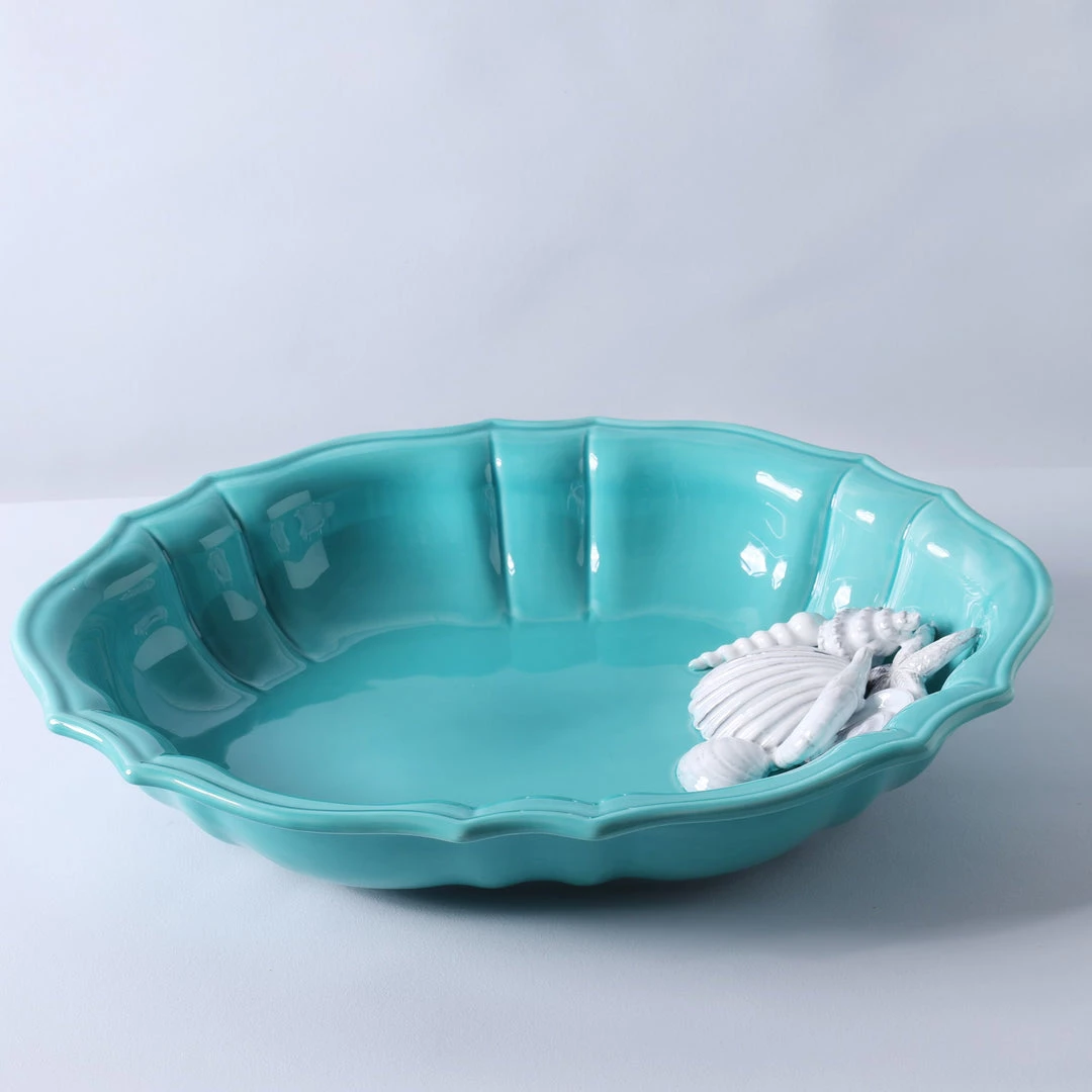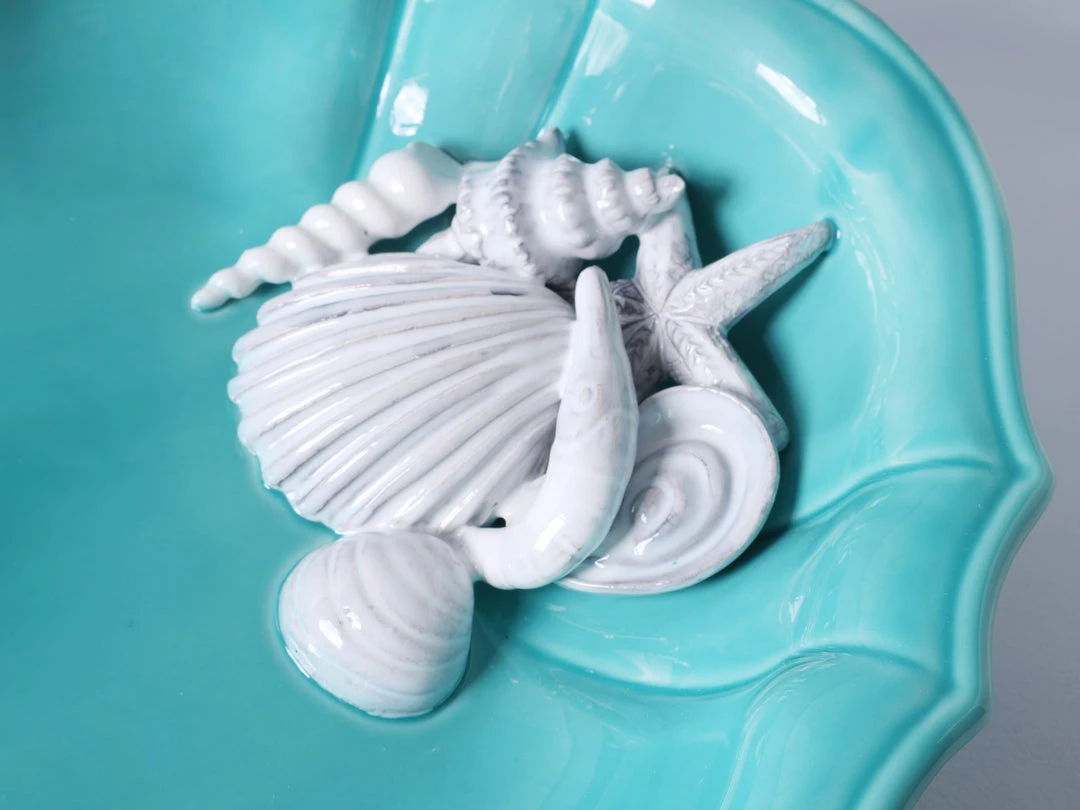 Instantly add the wow factor to your table with this gorgeous aqua blue serving bowl. Imitating the shape of a shell and adorned on one side with intricate ceramic shells, this serving bowl will be a guaranteed unique feature piece.