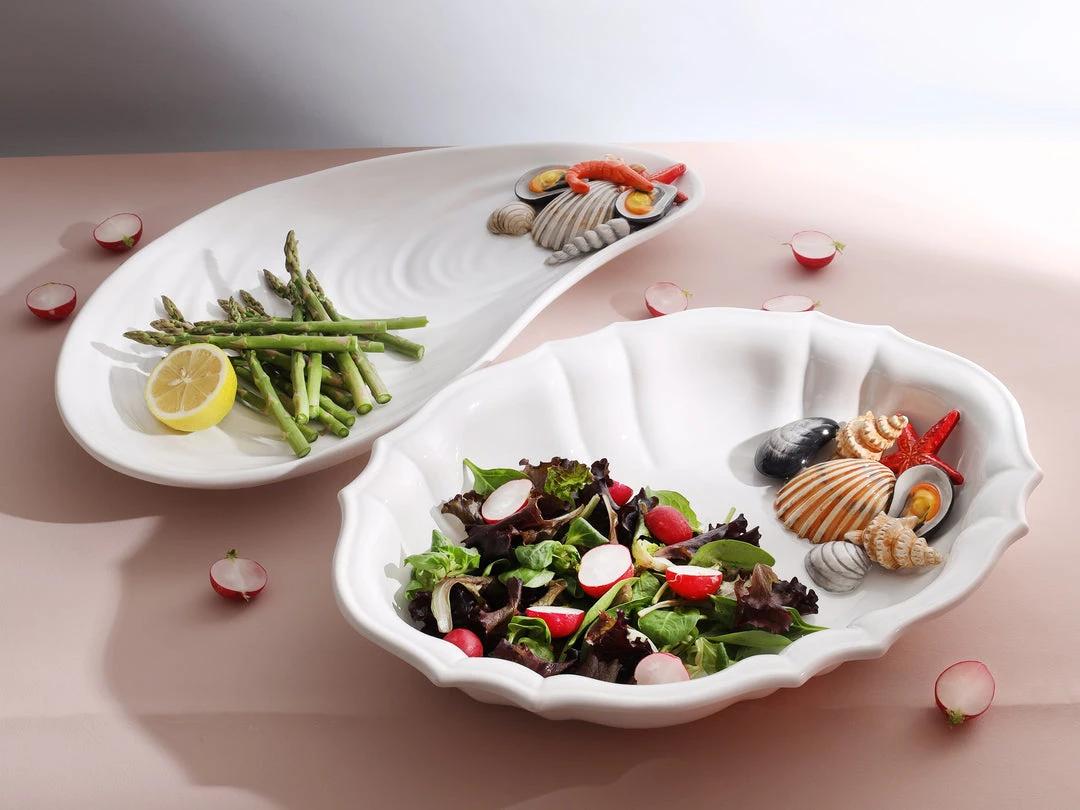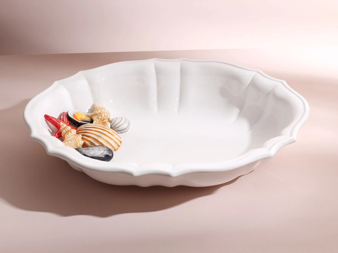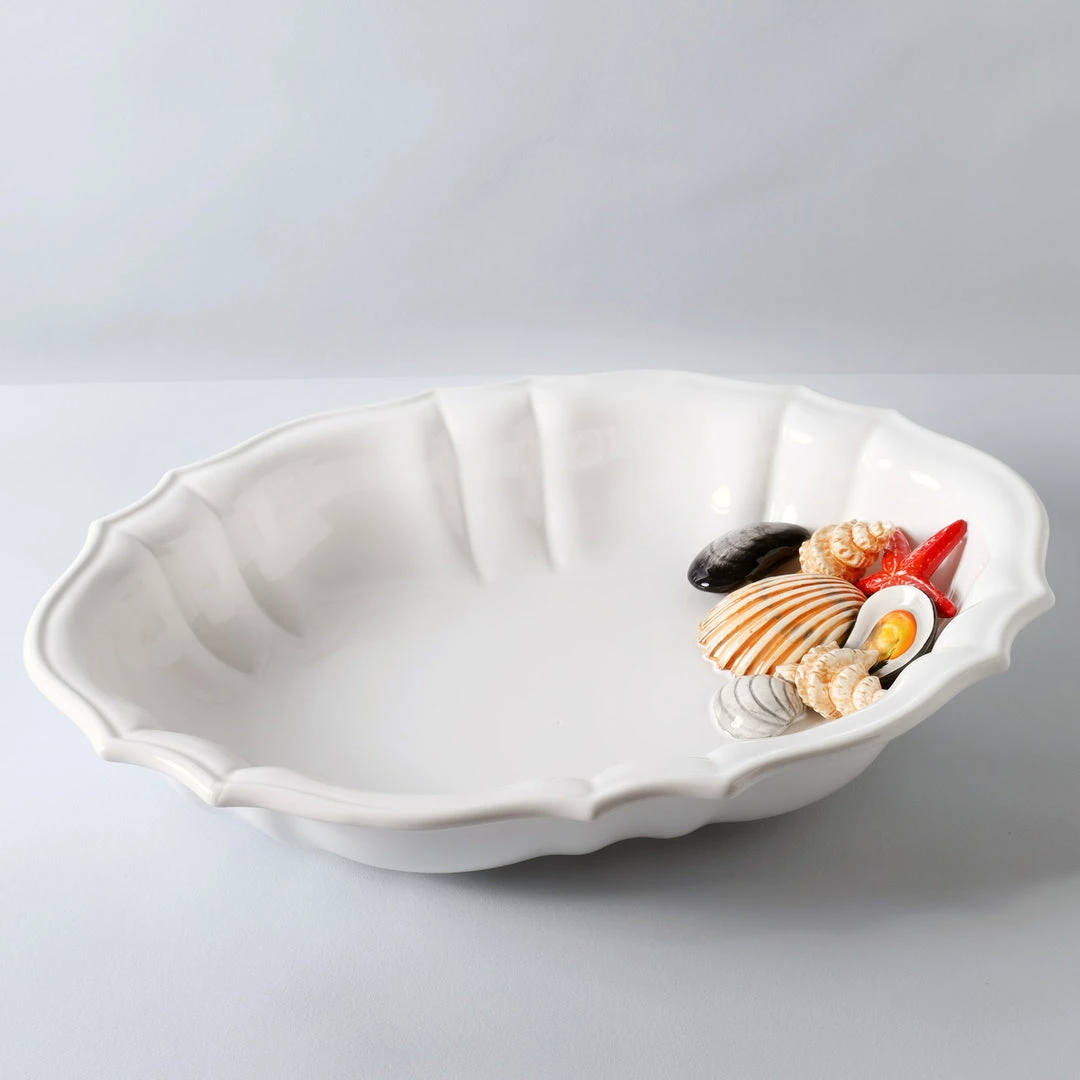 Instantly add the wow factor to your table with this gorgeous crisp white serving bowl. Imitating the shape of a shell and adorned on one side with intricate coloured ceramic shells, this serving bowl will be a guaranteed unique feature piece.