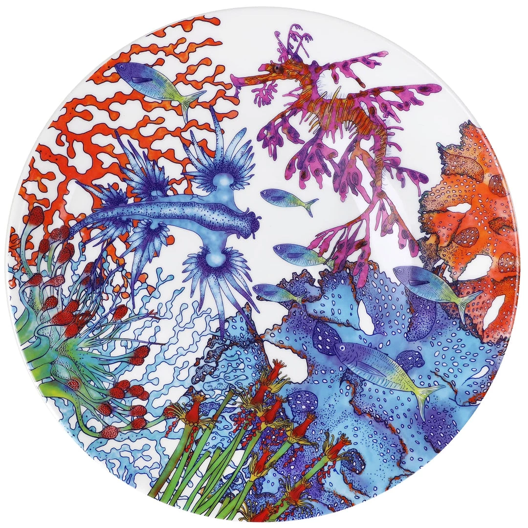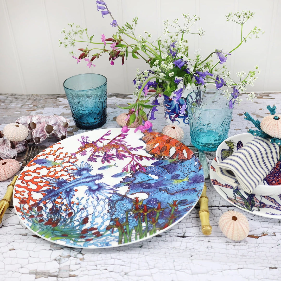 We chose an underwater coral reef scene for our large bone china dinner plate, with sea creatures full of colour and vibrant hues.