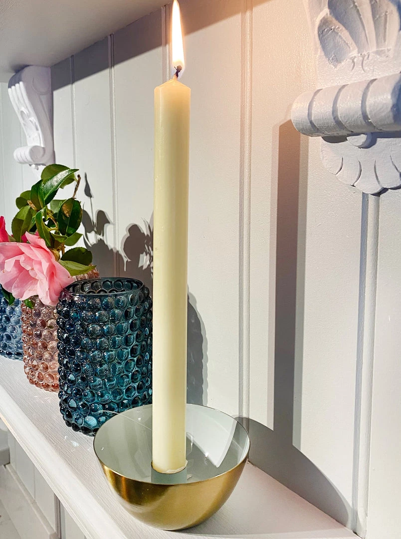 We just love these candle holders; with a burnished gold outside and enamelled colour inside, they are perfect for your tablescaping or as a decorative ornament.Team them up with our coloured dinner candles in beautiful tonal shades or add contrast colour for a bright pop accent.