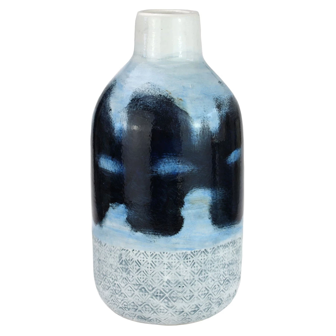 This painterly vase is so reminiscent of the artists who love to Cornwall and paint, bathed in the extraordinary light we have here. With painterly daubs of Prussia blue on top of shades of sky blue and a band of texture around the bottom, this vase looks perfect as a decorative item.