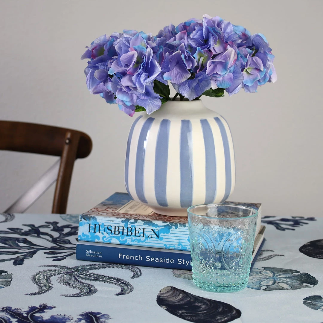 This is such a gorgeous vase! It looks so pretty on its own or filled with flowers. Its painterly glaze is in a soft blue stripe and the narrower neck will keep your flowers firmly in place.