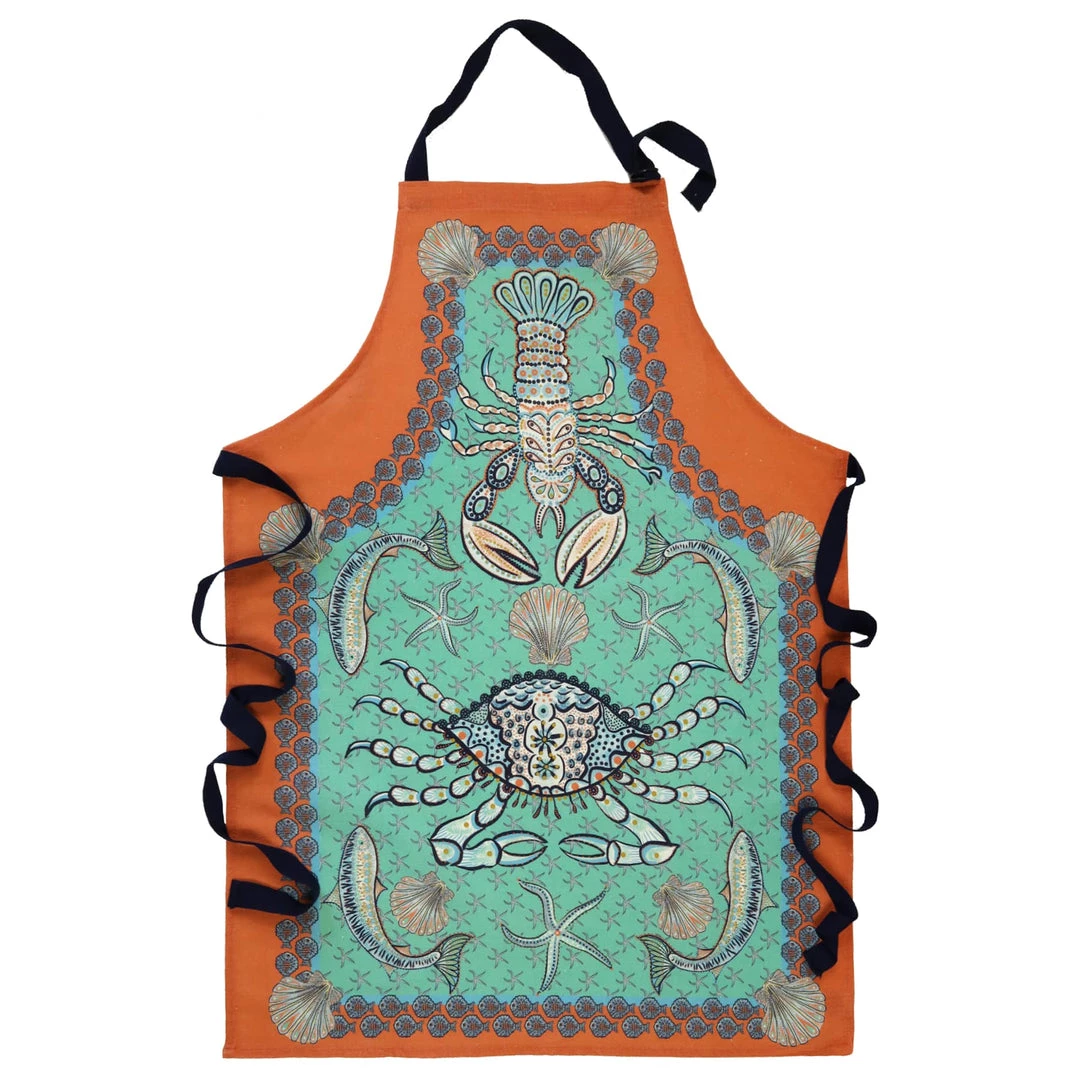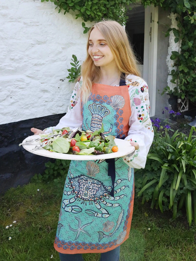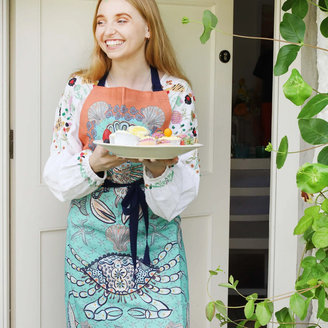 This apron instantly reminds you of long, hot summer days, turquoise waters, fun and play, and brings summer straight into your kitchen. The coral outline around the apron makes the cerulean blue pop, drawing your attention to the beautifully illustrated and intricate sea creatures. The centrepieces of the apron are the crab and lobster. Whilst still recognisable, their appearance is a unique twist on the traditional sea creatures, reflecting an array of global influences.