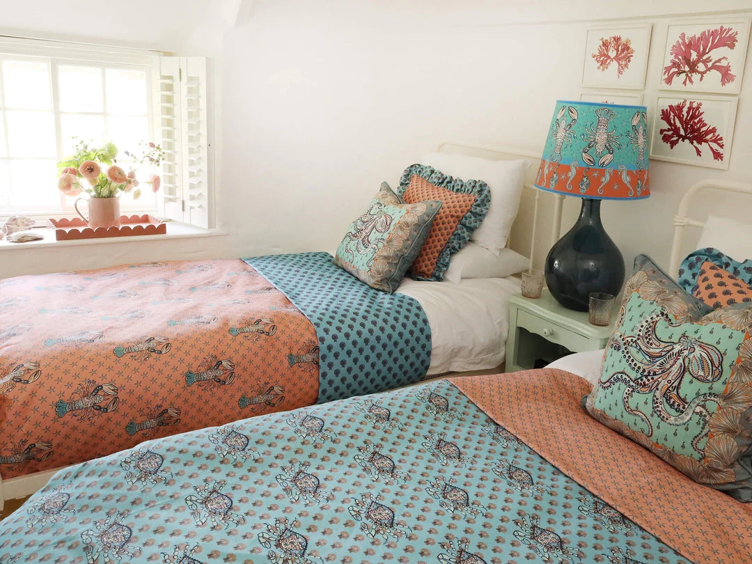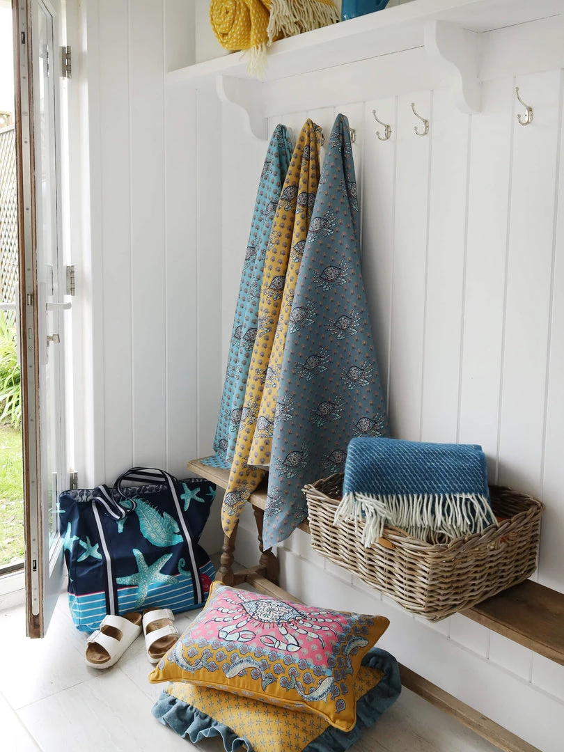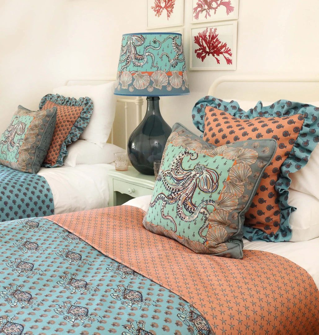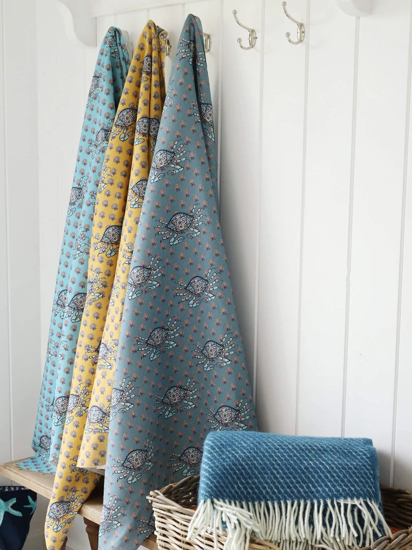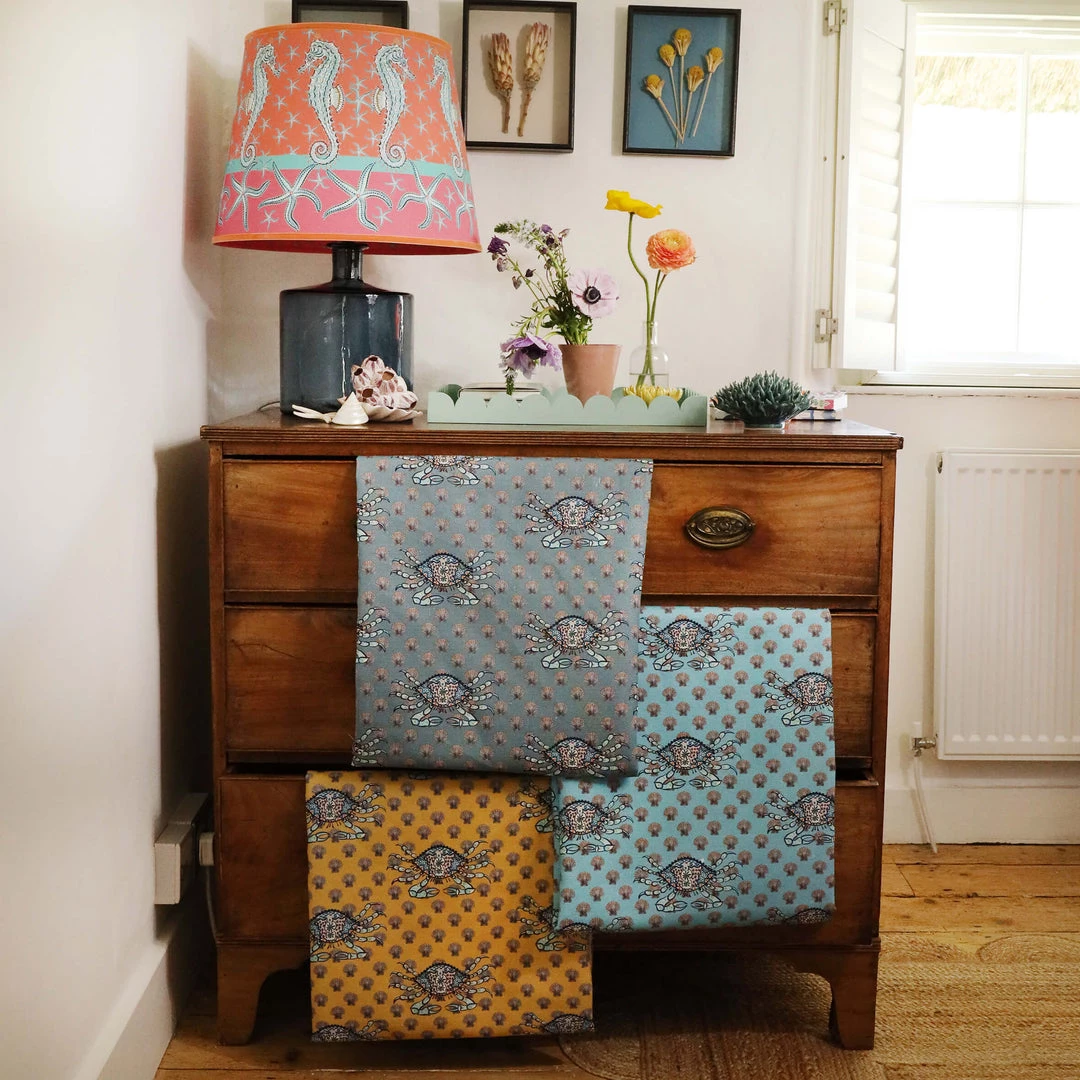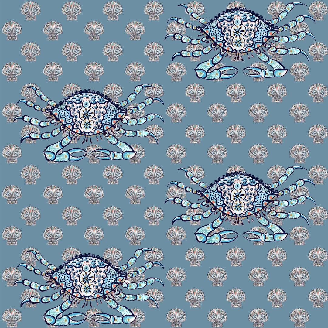 Our Byron Crab linen and cotton fabric showcases a unique design that features our handsome crab. On a background of calming airforce blue an intricately illustrated crab reflects a melting pot of influences. Behind the crab, a pattern of mini scallop shells in blue with a hint of coral is repeated, bringing the design to life.