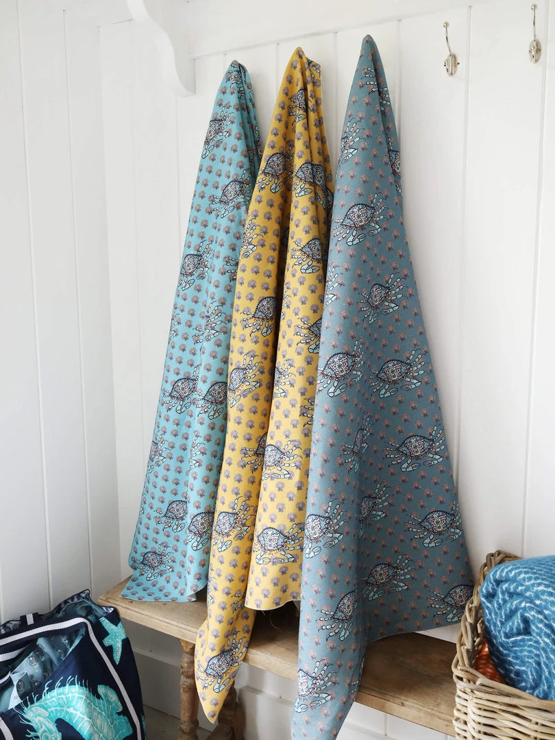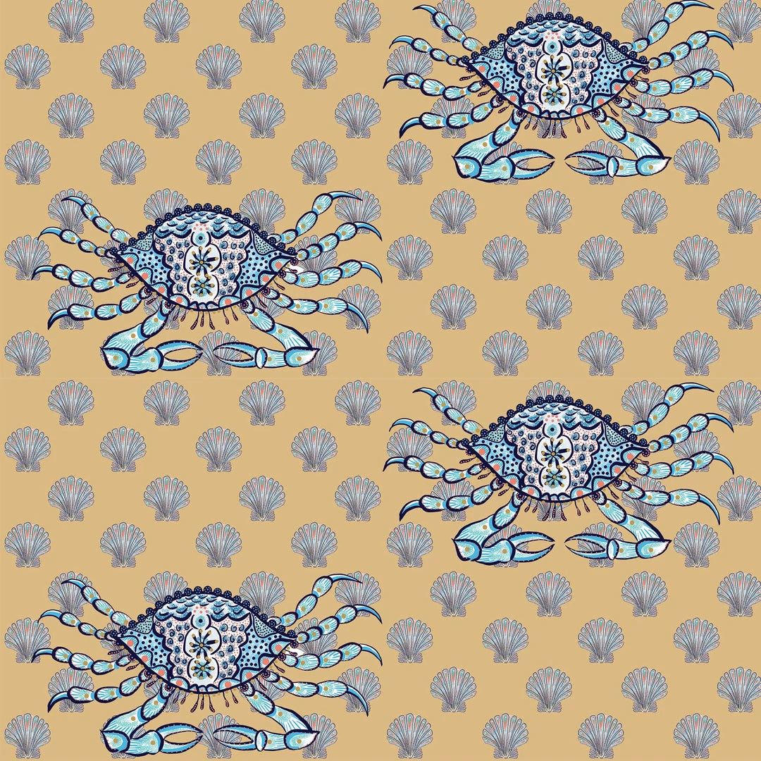 Our Byron Crab linen and cotton fabric showcases a unique design that features our handsome crab. On a background of sun washed yellow, an intricately illustrated crab reflects a melting pot of influences. Behind the crab, a pattern of mini scallop shells in blue with a hint of coral is repeated, bringing the design to life.