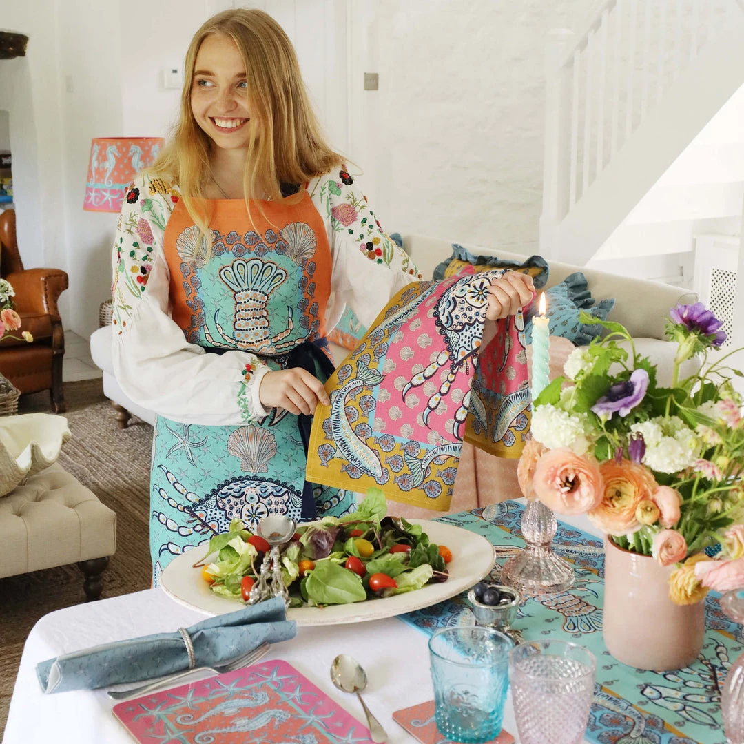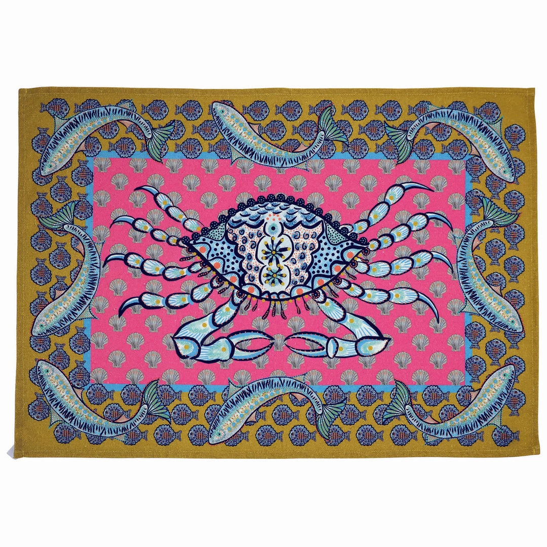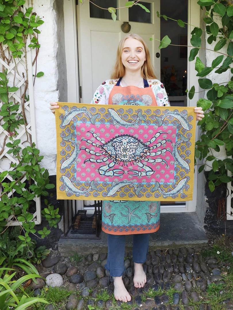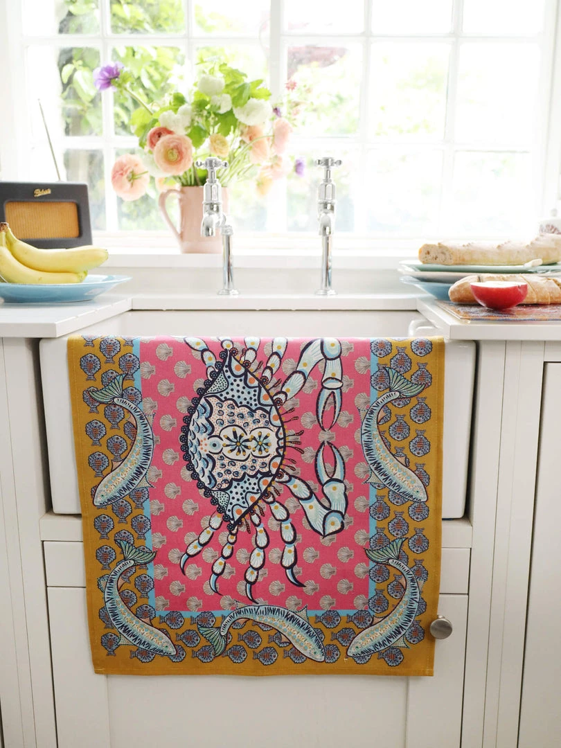 This eye catching tea towel is simply gorgeous. The contrast of the bright pink, blues and sun washed yellow background makes the intricately illustrated crab and sea creature design absolutely pop. Made from quality linen and cotton, the tea towel feels good and dries well, and at the same time instantly adds those playful and bright summer feels to your kitchen space.