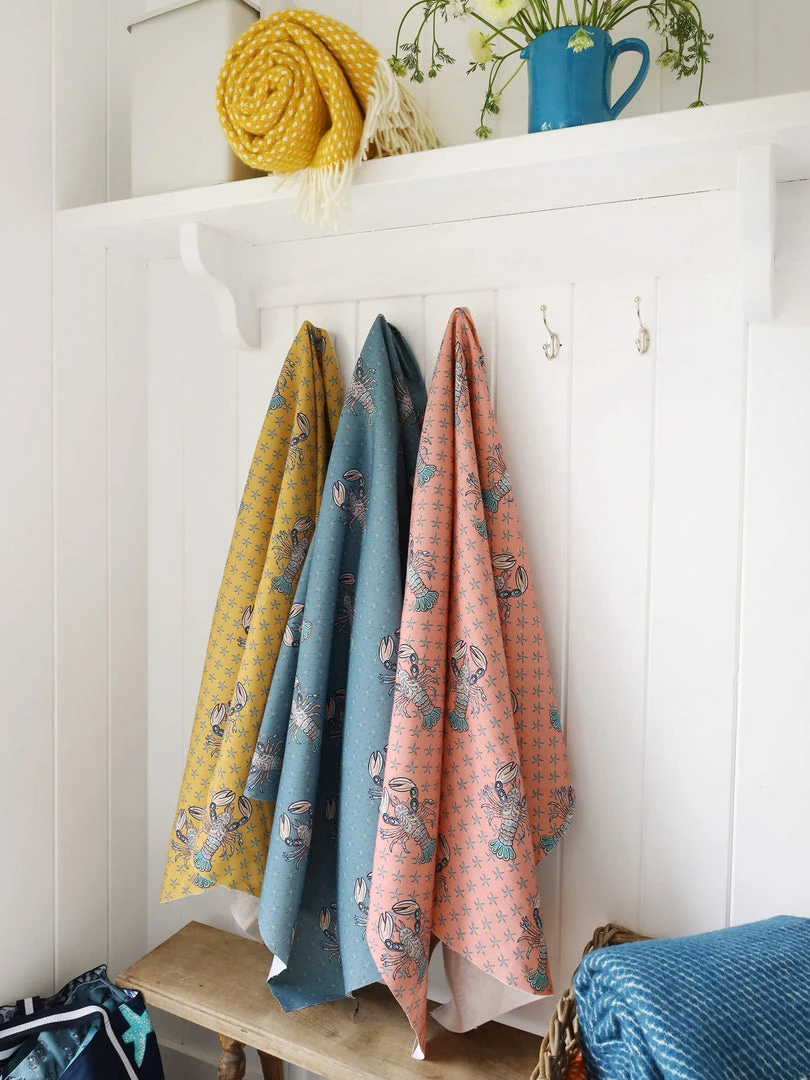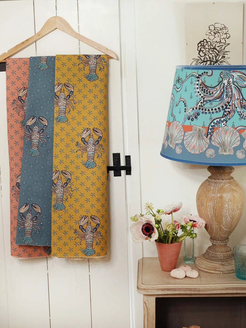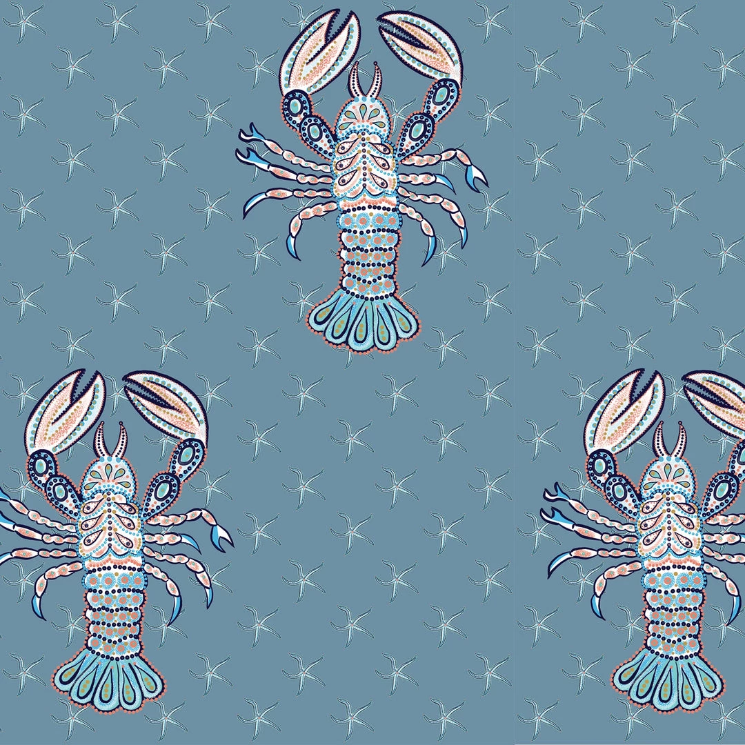 Our Byron lobster fabric showcases a unique design that’s printed on a background of airforce blue linen and cotton. Intricately illustrated, the handsome lobster floats in front of a sea of mini starfish giving a contemporary twist to the traditional coastal look.