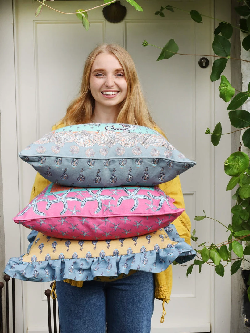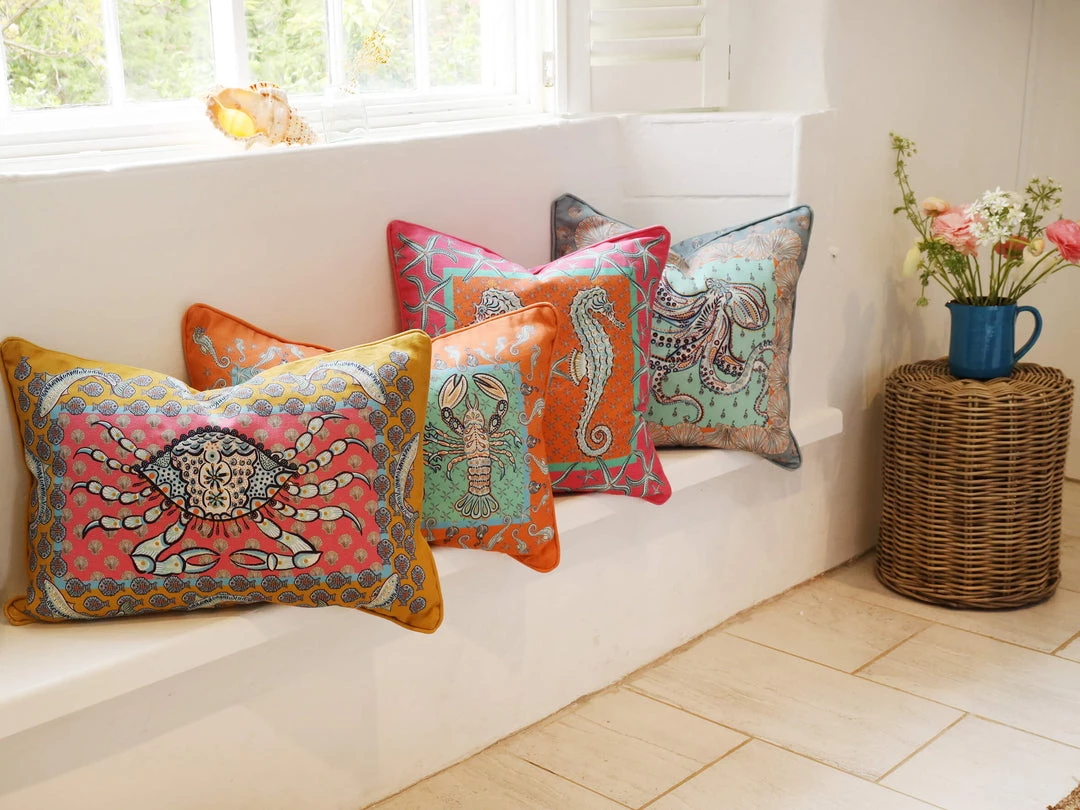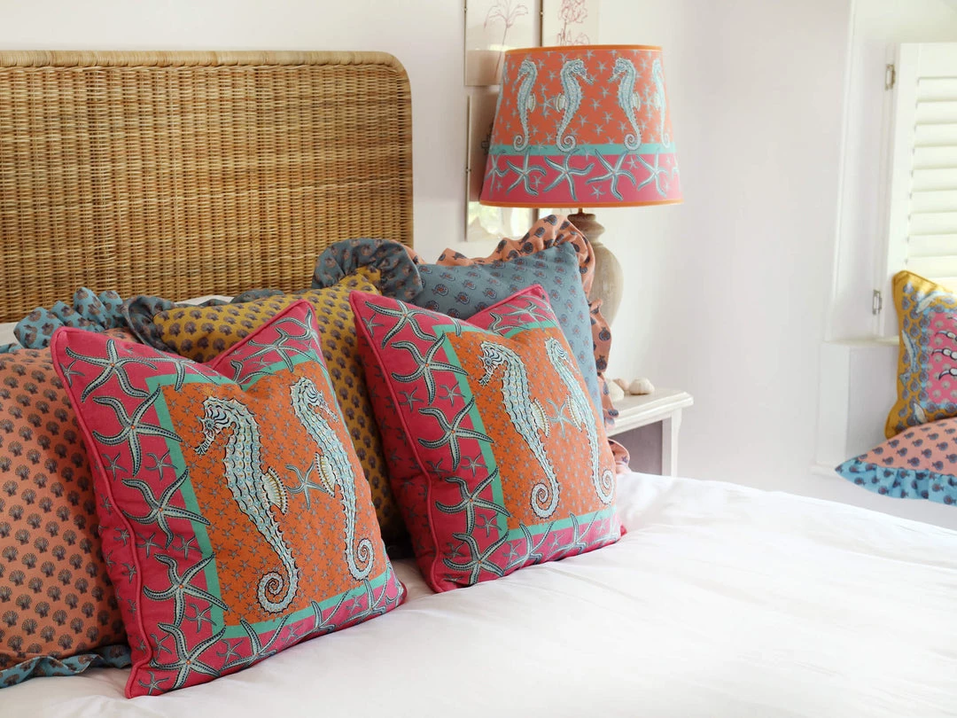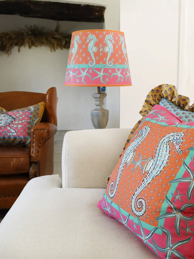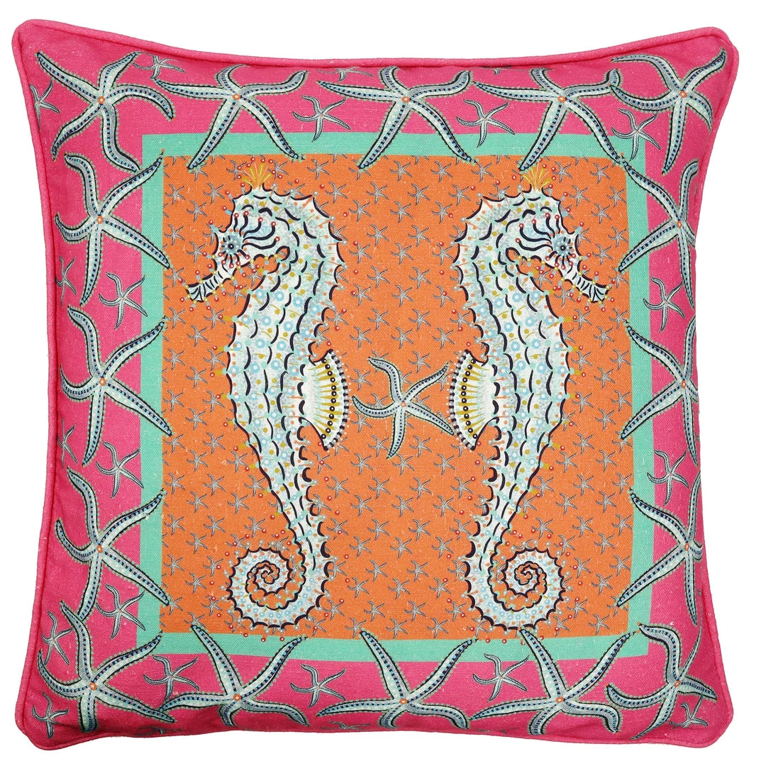 This gorgeous cushion reminds you of exotic travels and summer days. Set on a bright pink background, this intricate design is full of energy. Playful, bright and unique, this cushion instantly brings summer feels into your home.