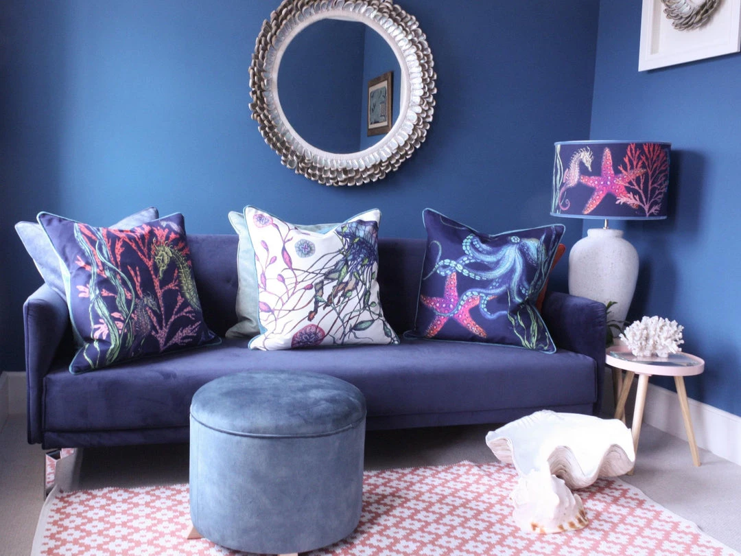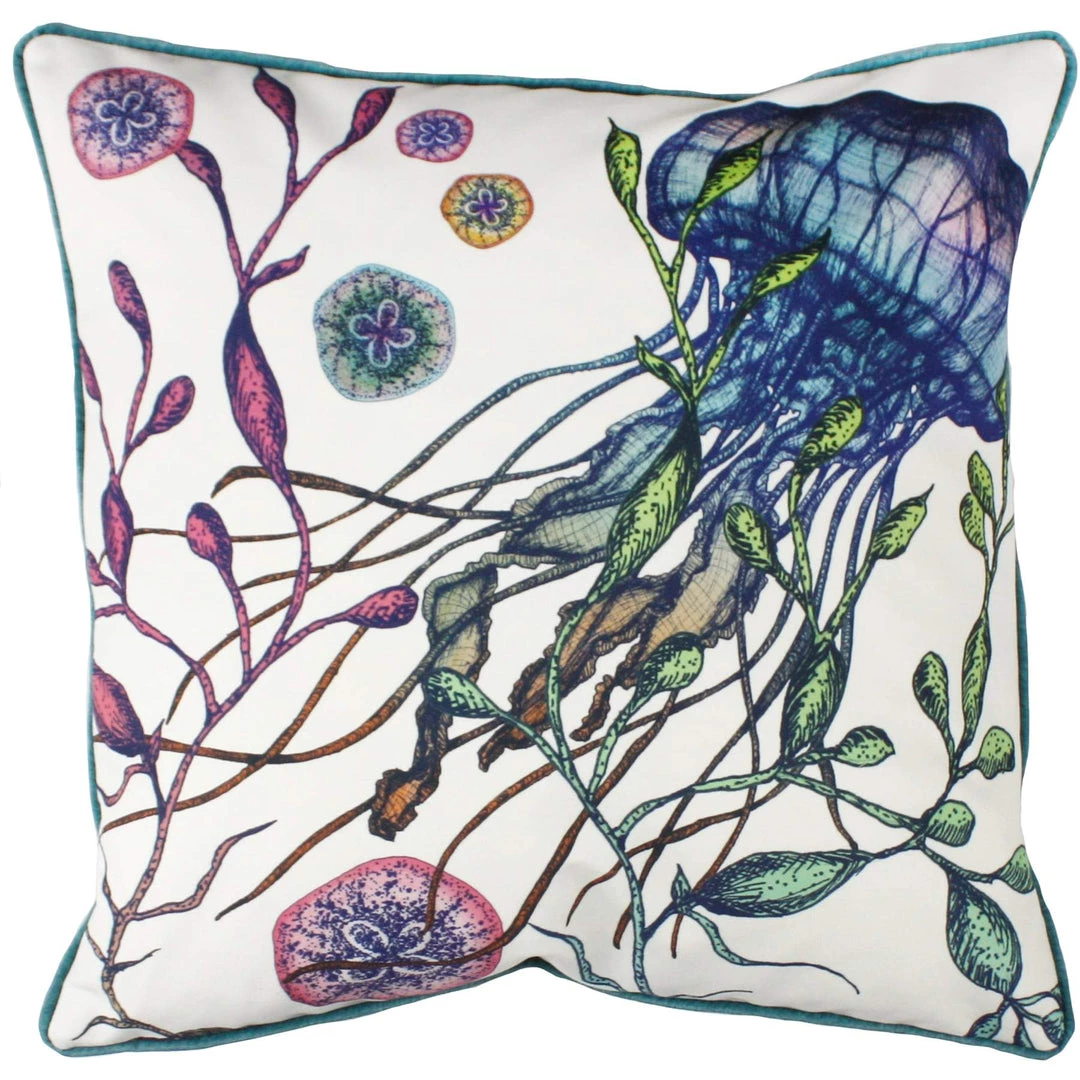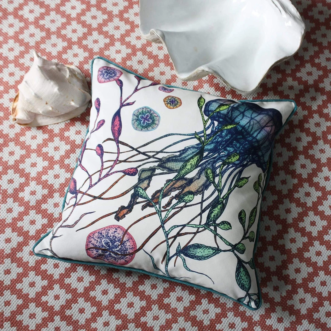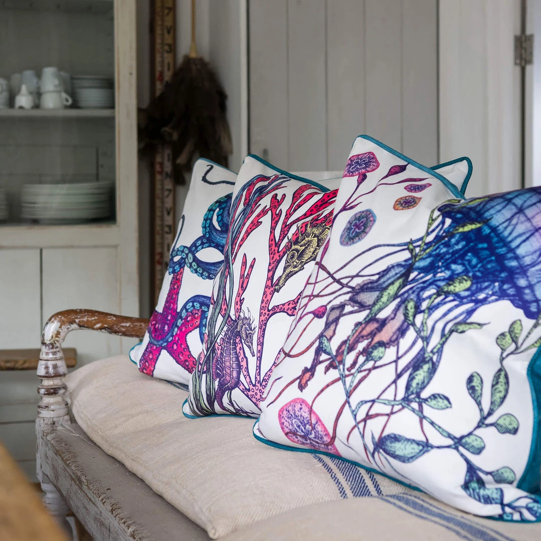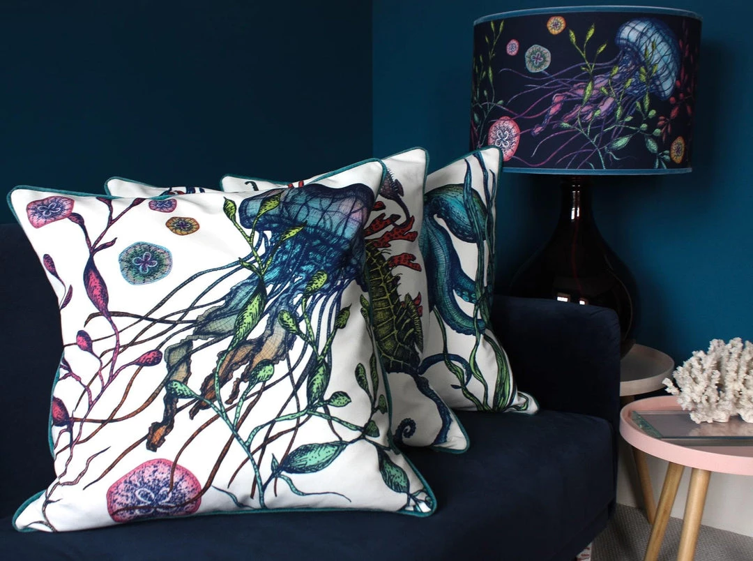 Jellyfish are regularly spotted in Cornish waters and these ethereal creatures are mesmerising with their rainbow colours and varied shapes. Our beautiful cushion captures their magic, fluidity and elegance, so dive in! The colours really pop on this white velvet background and we’ve chosen a beautiful turquoise velvet for the back and piping, you can almost imagine you’re underwater.