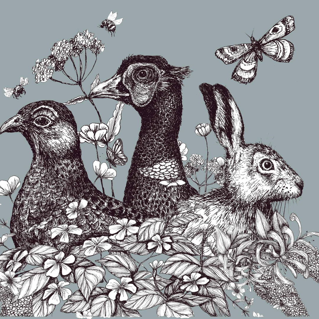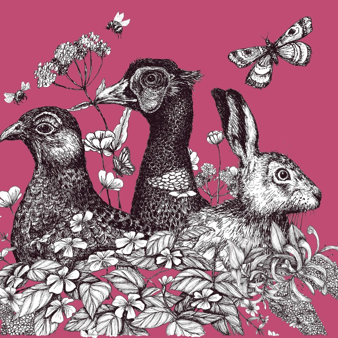 These napkins feature our Fox,Grouse and Hare surrounded by undergrowth,bees and butterflies, beautifully hand drawn in pen and ink. Inspired by life at Trenwith, a beautiful 16th century estate which sits nestled in the Cornish countryside above a sheltered creek on the Helford River. Choose from two colourways, Helford,a cool grey/green and Rhubarb, a beautiful pinky red.