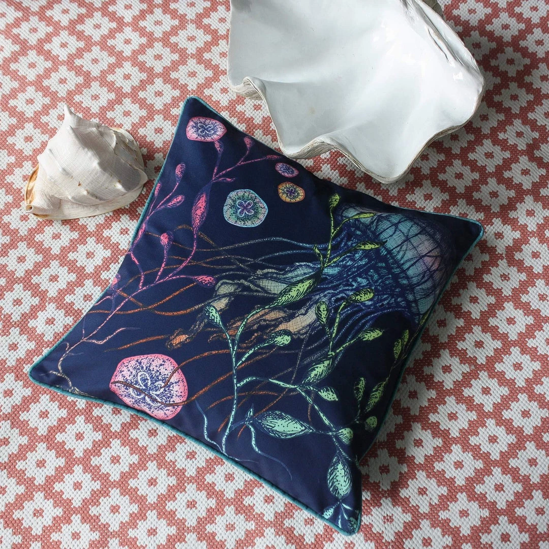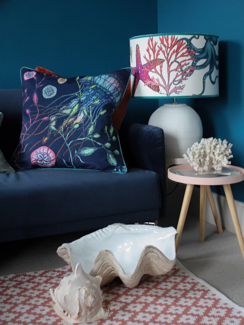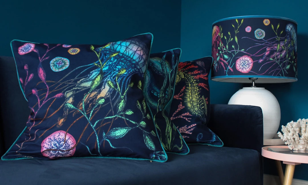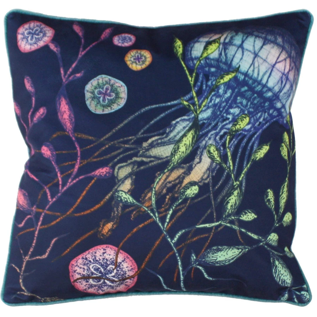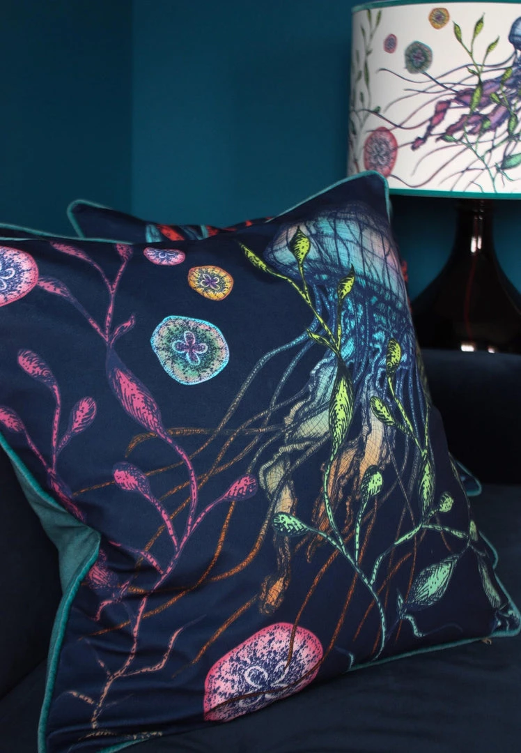 Jellyfish are regularly spotted in Cornish waters and these ethereal creatures are mesmerising with their rainbow colours and varied shapes. Our beautiful cushion captures their magic, fluidity and elegance, so dive in! The colours really pop on this inky blue velvet background and we’ve chosen a beautiful turquoise velvet for the back and piping, you can almost imagine you’re underwater.