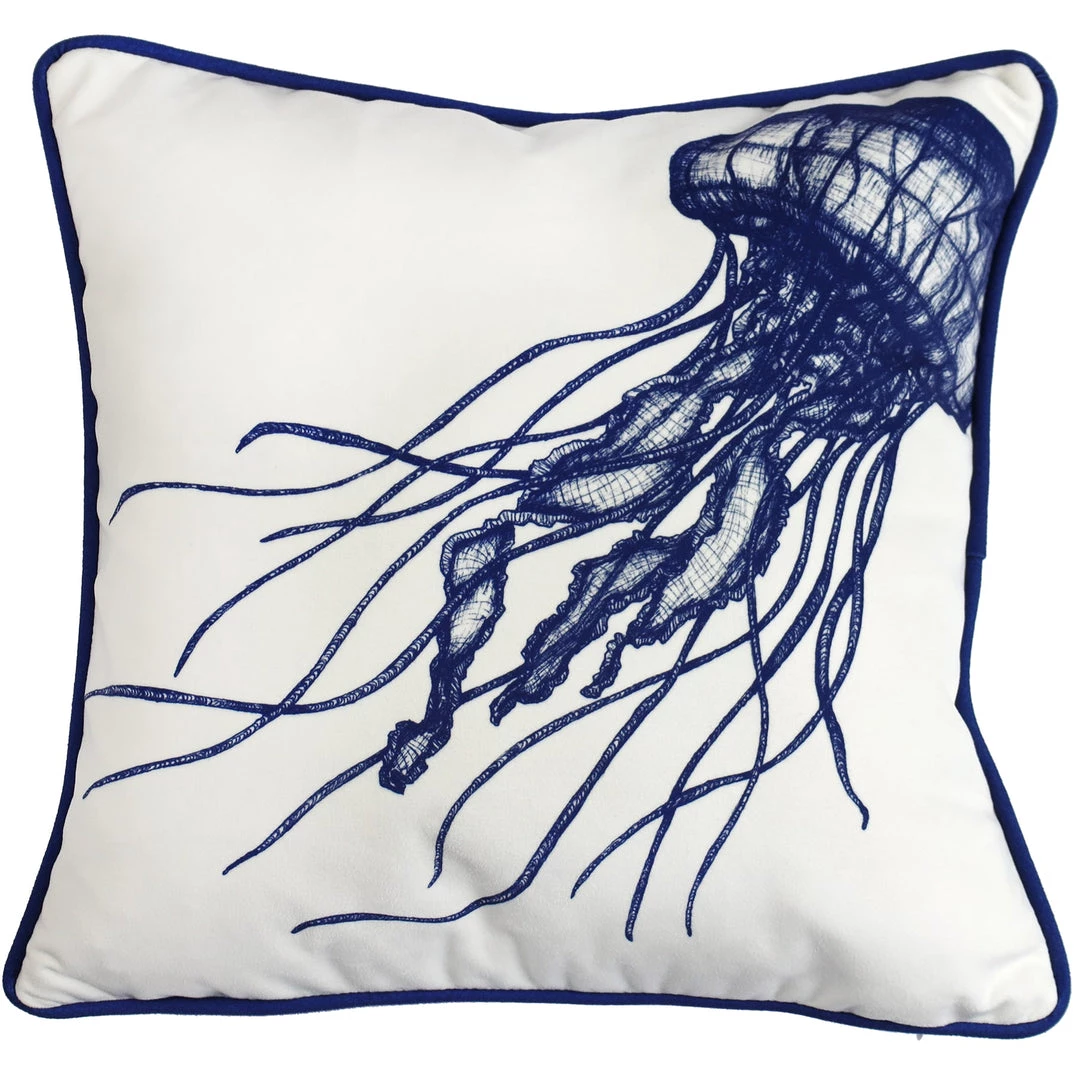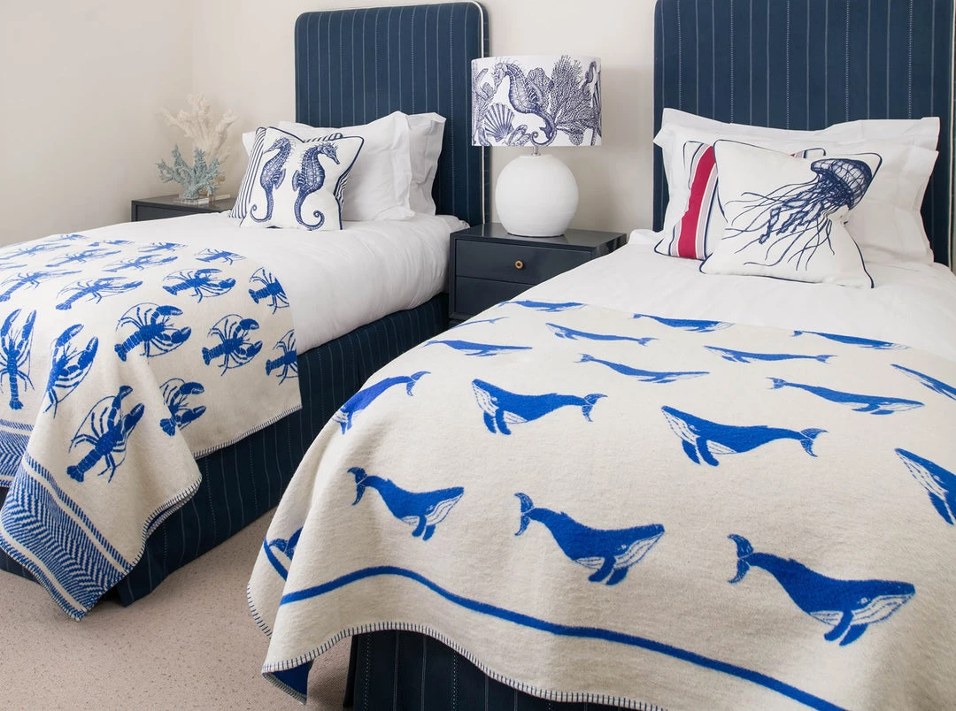 Our new re-vamped collection is looking great! Naturally we’ve included our beautiful Jellyfish and given it a twist by using luxe velvet and a co-ordinating striped back. So whichever way you choose to use your cushions, they’ll look great. The back has a red and white stripe combination, it’s great to see that flash of colour with the blue and white.