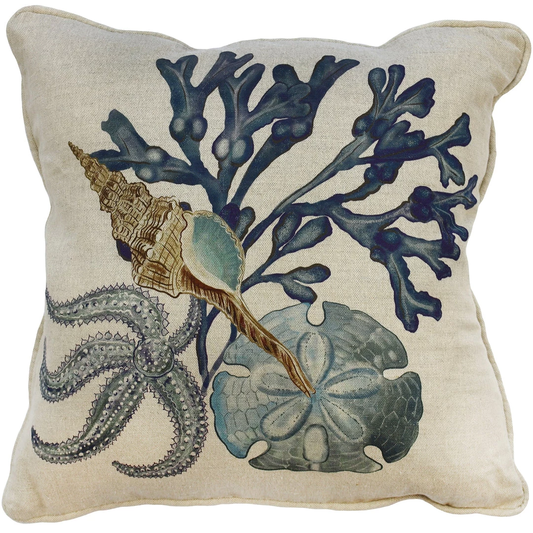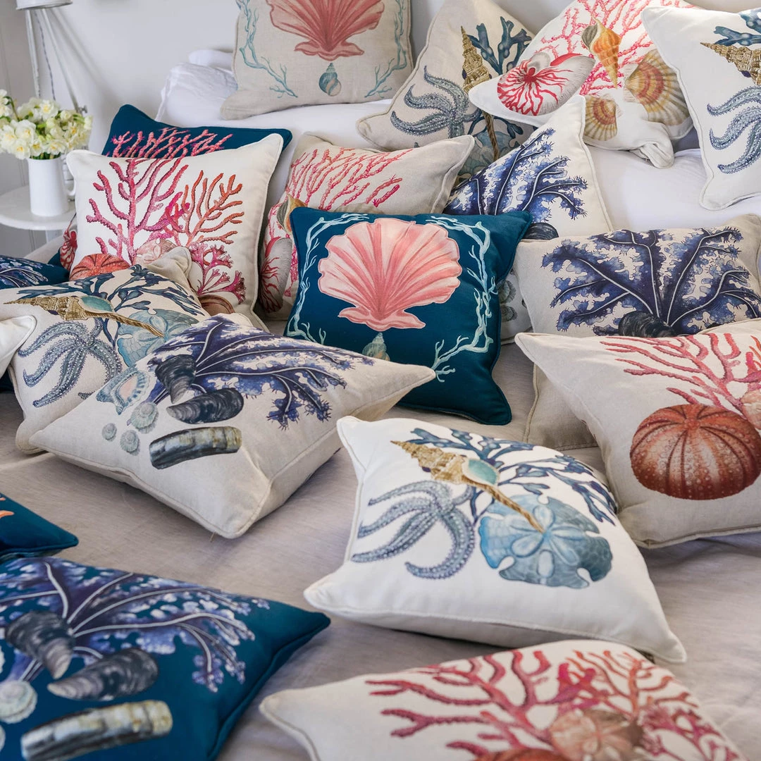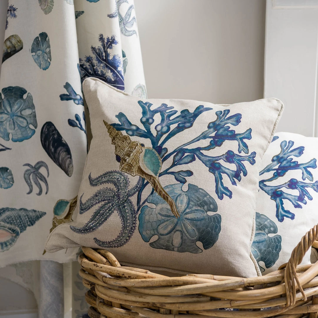 What a beautiful combination of the ethereal starfish, a rare sand dollar, [have you ever been lucky enough to find one washed up on the beach?] and a Whelk with a gorgeous turquoise inner, against an inky blue piece of bladderwrack seaweed. Choose from two base colours; off-white linen or natural for this beautiful cushion.