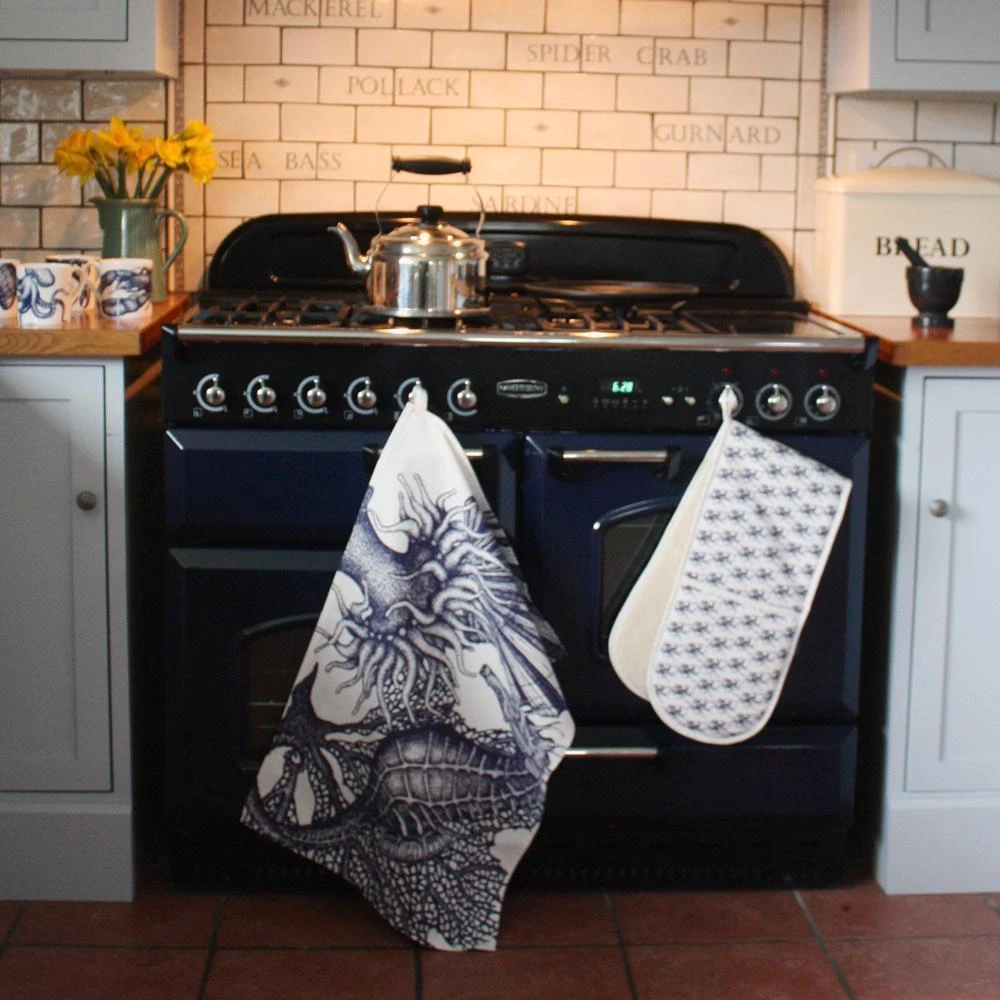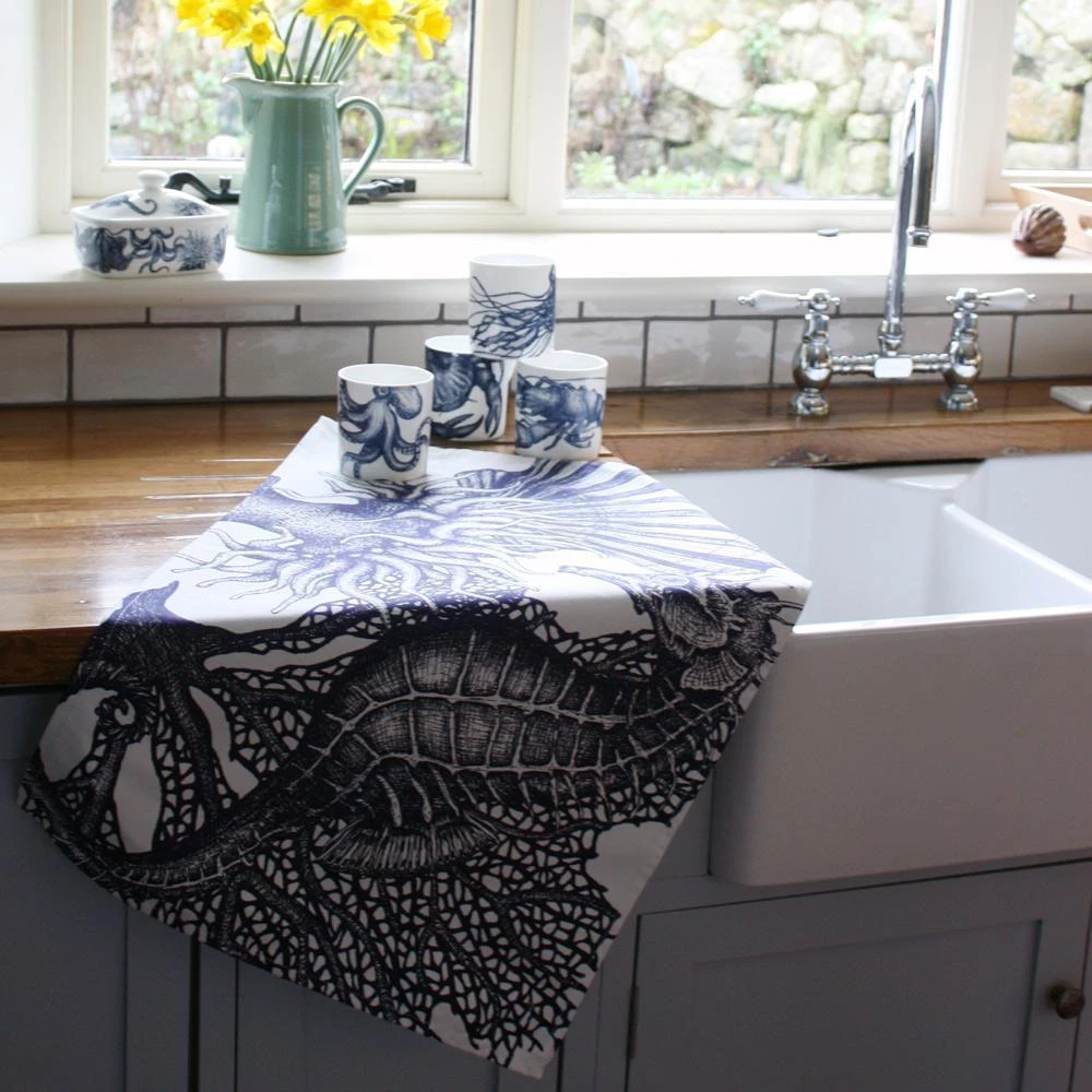 This striking illustration on our Seahorse Tea Towel of this beautiful sea creature swimming amongst fan coral, anemones and the classic scallop shell creates a beautiful underwater ocean scene.