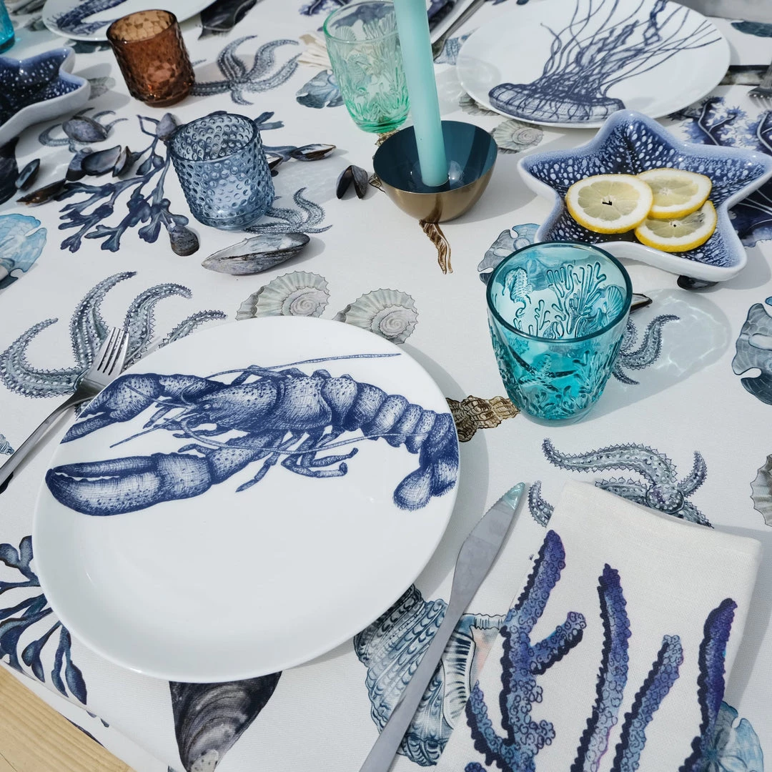 Our Rockpool tablecloth will ensure dinner will become an unforgettable experience. An all over pattern of shells and seaweeds will certainly make meal times a little more fun! This gorgeous cloth is the perfect excuse to dress your table and impress your friends. Not only does it look great but it has a water repellent coating on it that makes little spillages easier to wipe up. You can use on its own or dress it up with our Classic placemats and fine bone china.