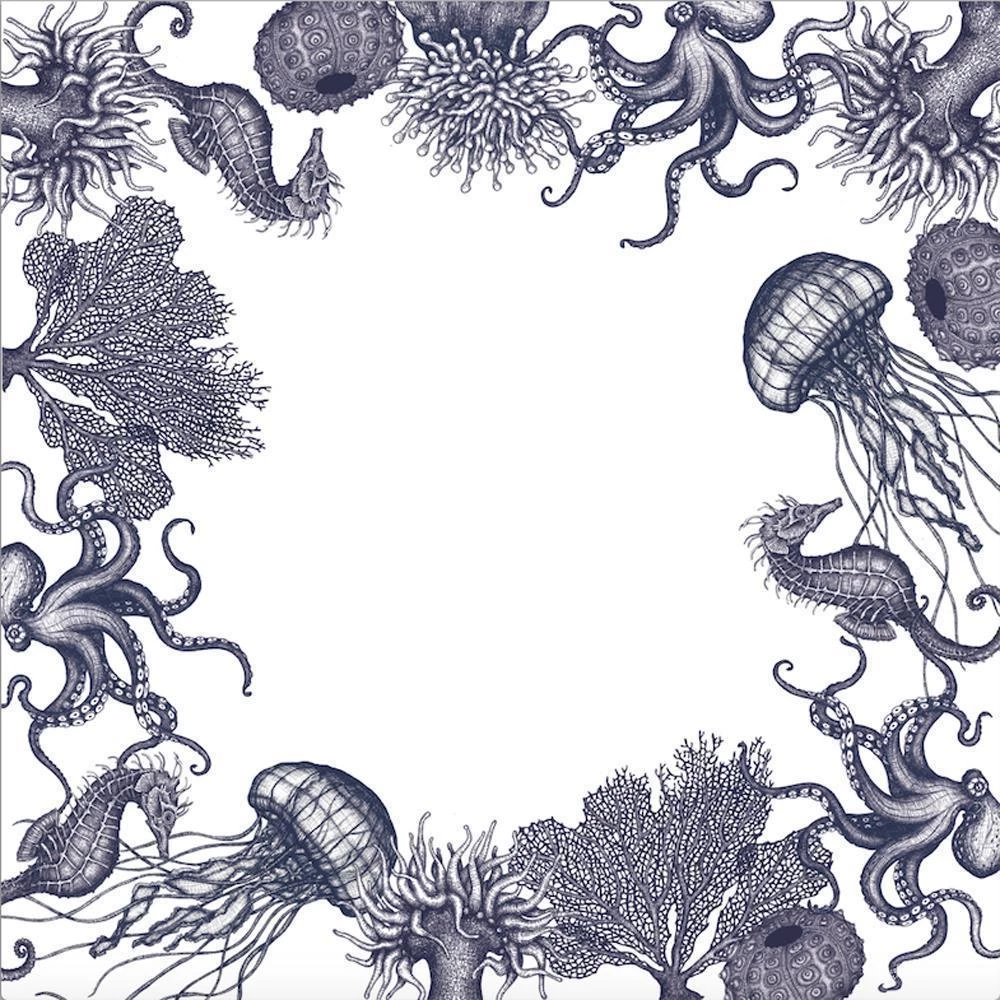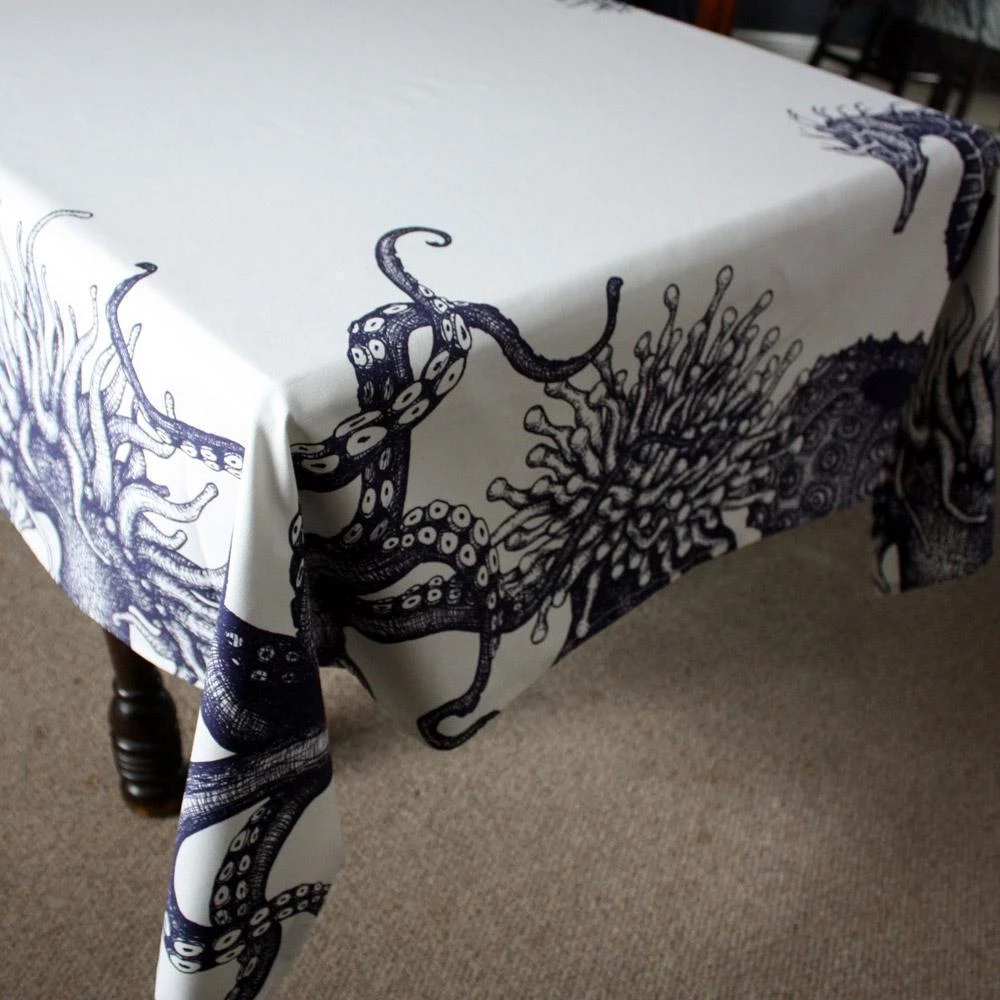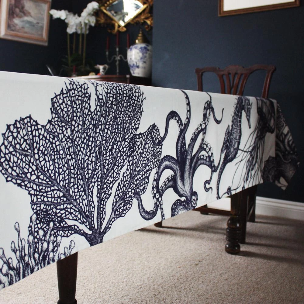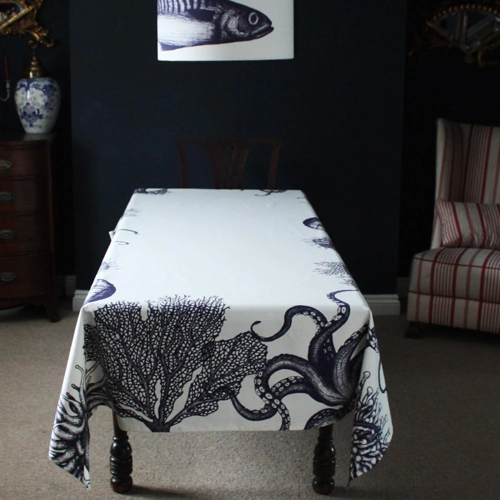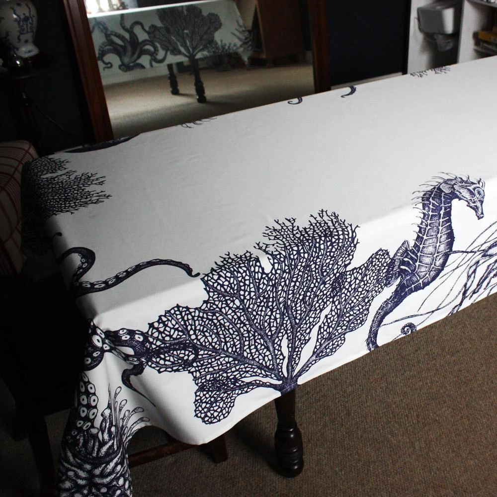 Our coastal tablecloth will ensure your dining will become an unforgettable experience. With a border of coral, sea anemones and sea creatures in our trademark deep navy blue on crisp white, you will be transported straight to a beautiful underwater scene.