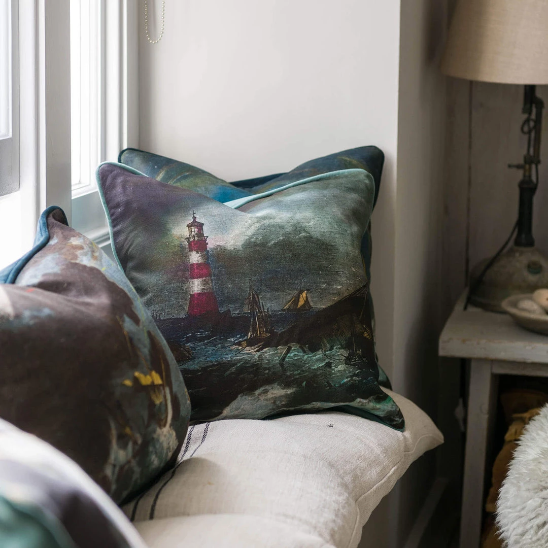Our Shipwreck cushion collection uses imagery from a series of 18th century hand-coloured prints depicting a series of ‘ships in distress’ in dramatic night time ocean conditions. In this one you can see the ships sinking in front of red and white striped lighthouse and stormy skies.