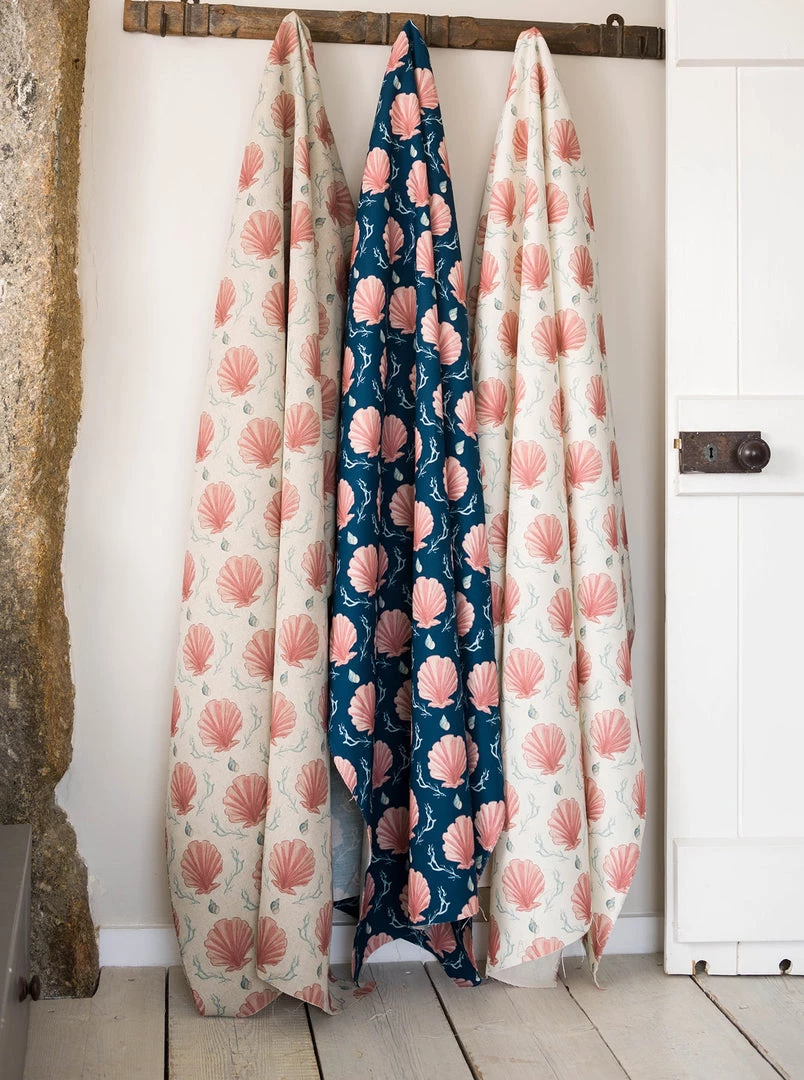 Our beautiful Manderley fabric showcases classic scallop shells and delicate branches of coral. Cornish romantic novelist, Daphne Du Maurier’s descriptions of picturesque Cornish waters and of times gone by inspired this classic, yet contemporary pattern. It suits a beach house just as much as an eclectic patterned home in-land.