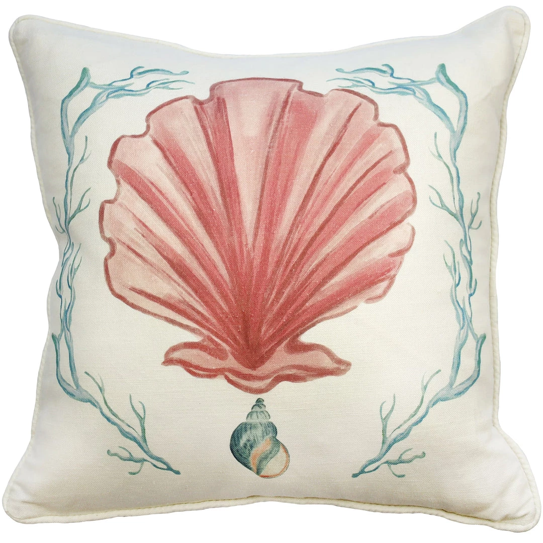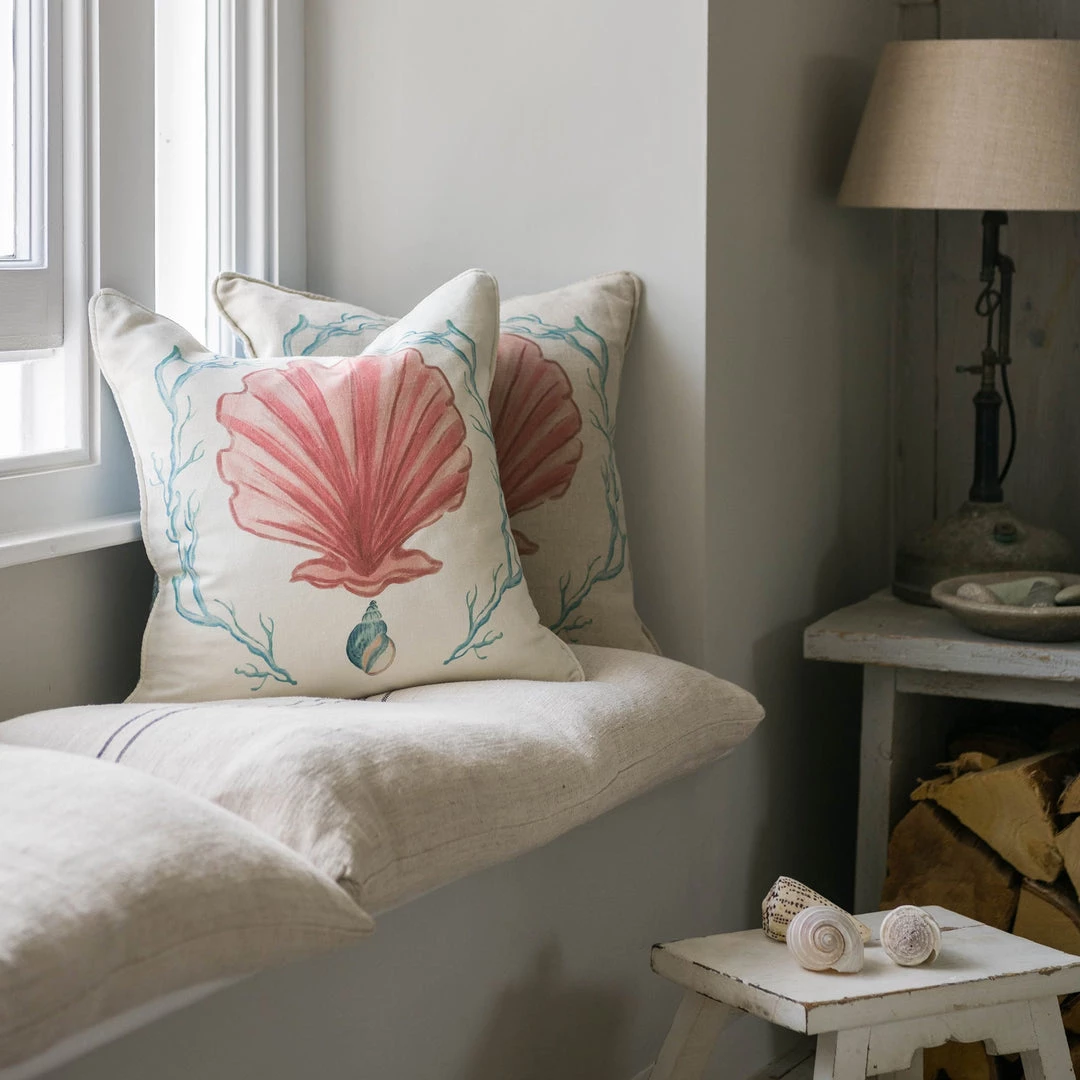 These cushions are reversible and backed with ‘Navron’ our very pretty Mini scallop shell design which is the perfect accompaniment to our Manderley pattern. Choose from three base colours; ink blue, natural or off-white linen for this beautiful cushion.