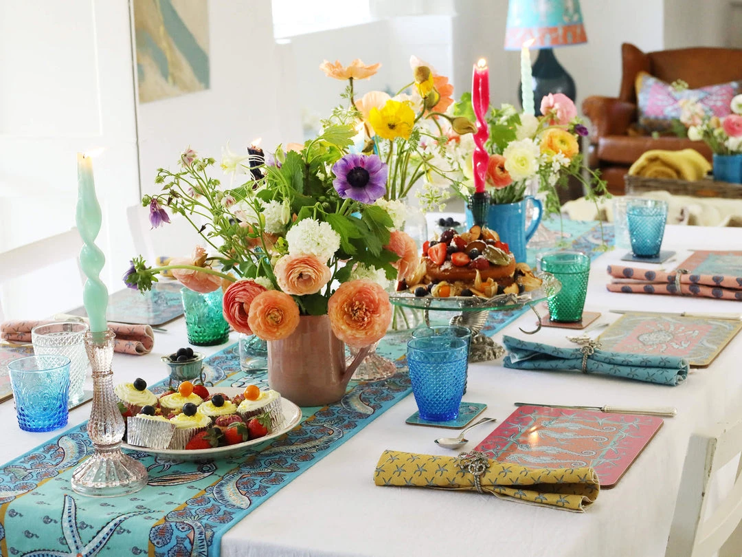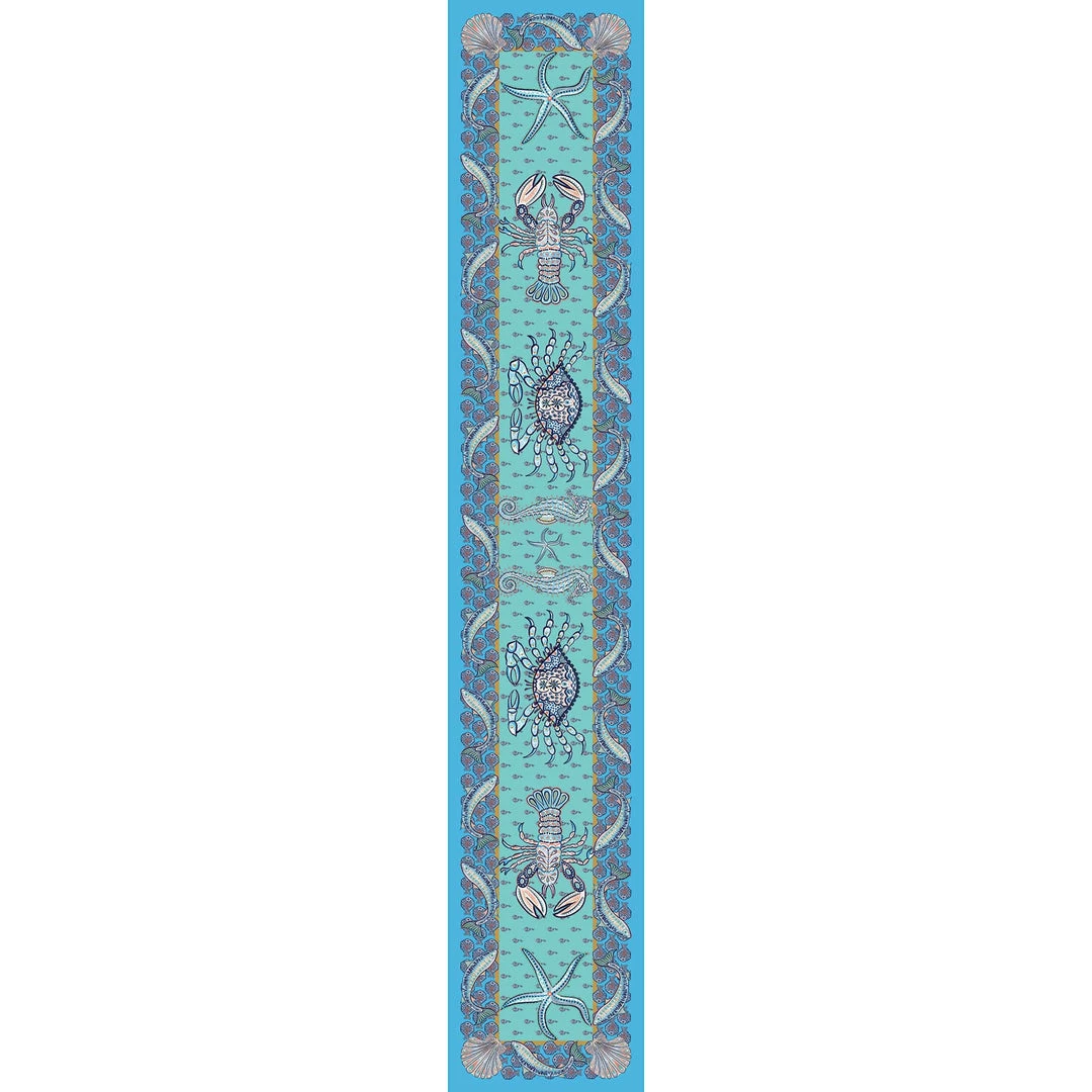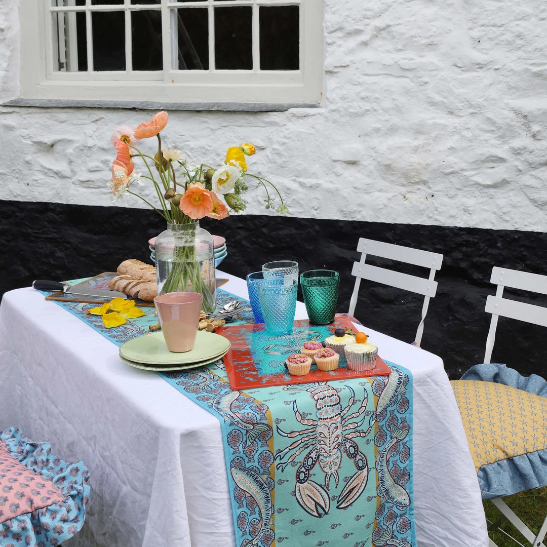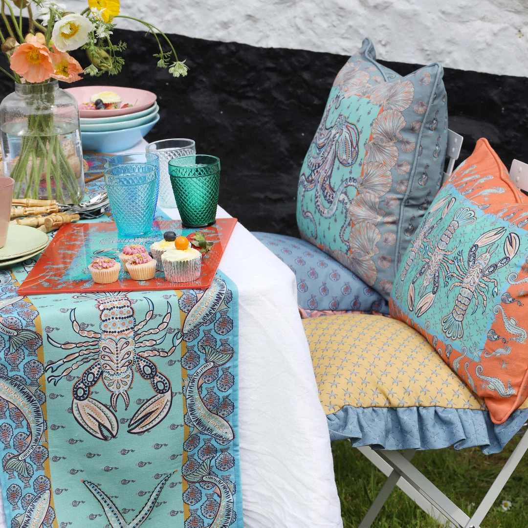 Our intricately illustrated lobster, crab, seahorse and starfish adorn the middle of the runner on a cerulean blue background. Surrounding them is a border of fish on a background of a striking cornflower blue. These colours instantly evoke memories of sparkling water and the coast, bringing summer feels into your home.Instantly turn your mealtime into an experience.