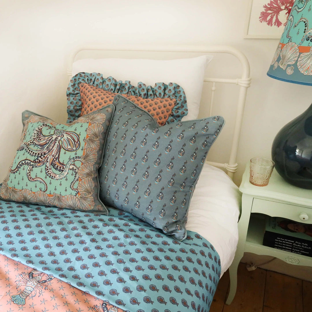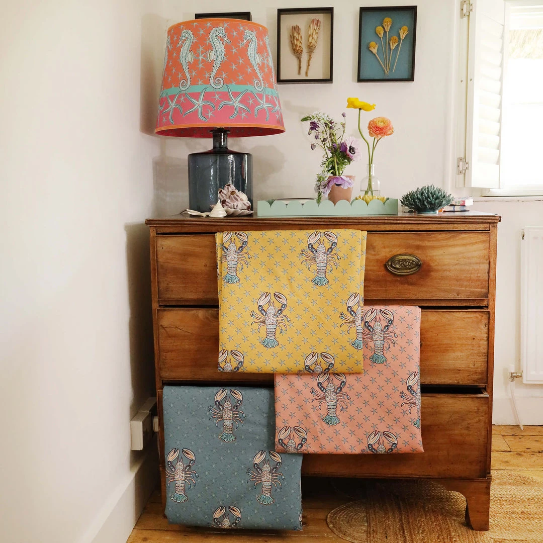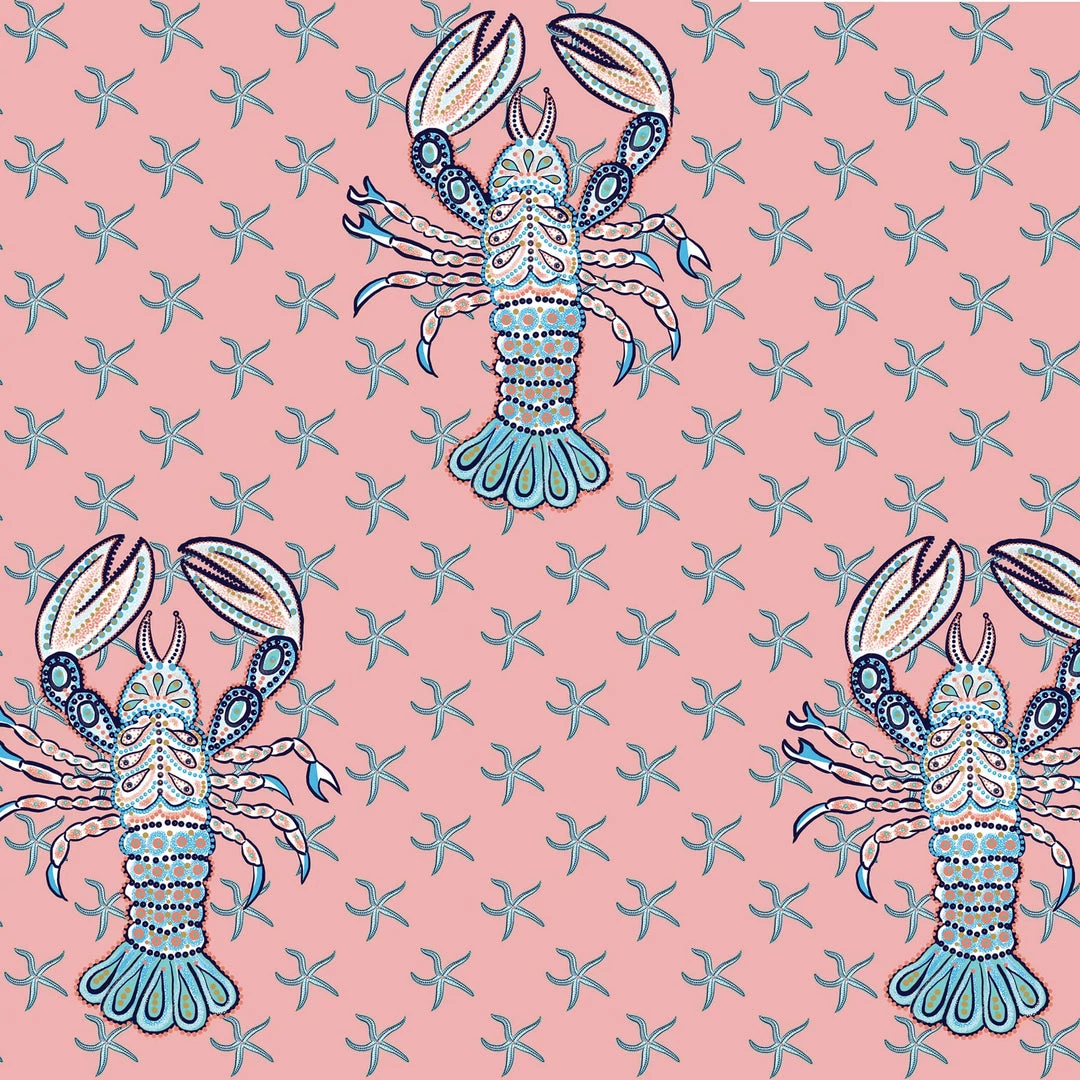 Our Byron lobster fabric showcases a unique design that’s printed on a background of Provence pink linen and cotton. Intricately illustrated, the handsome lobster floats in front of a sea of mini starfish giving a contemporary twist to the traditional coastal look.