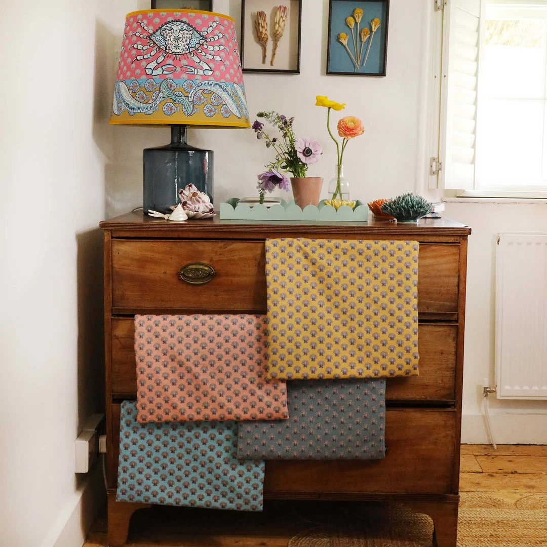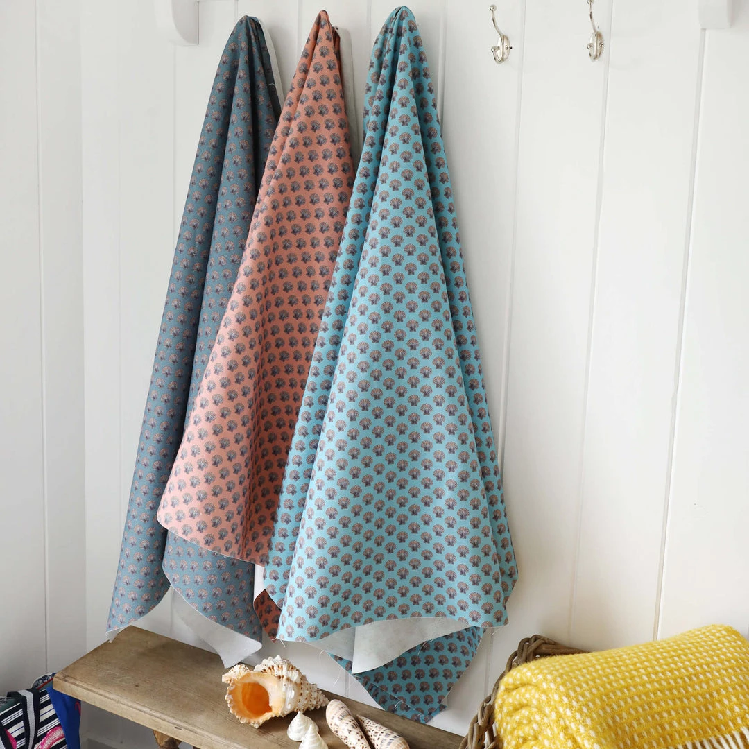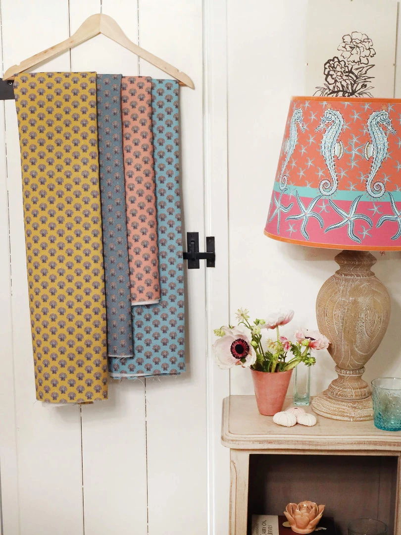 Our Byron mini shell design is simple, yet striking. It showcases an intricately detailed scallop shell in coral and blues hues, that appears to float on a Provence pink linen and cotton background. Whatever it is you’re making, it’s sure to be brought to life with this exclusive fabric.