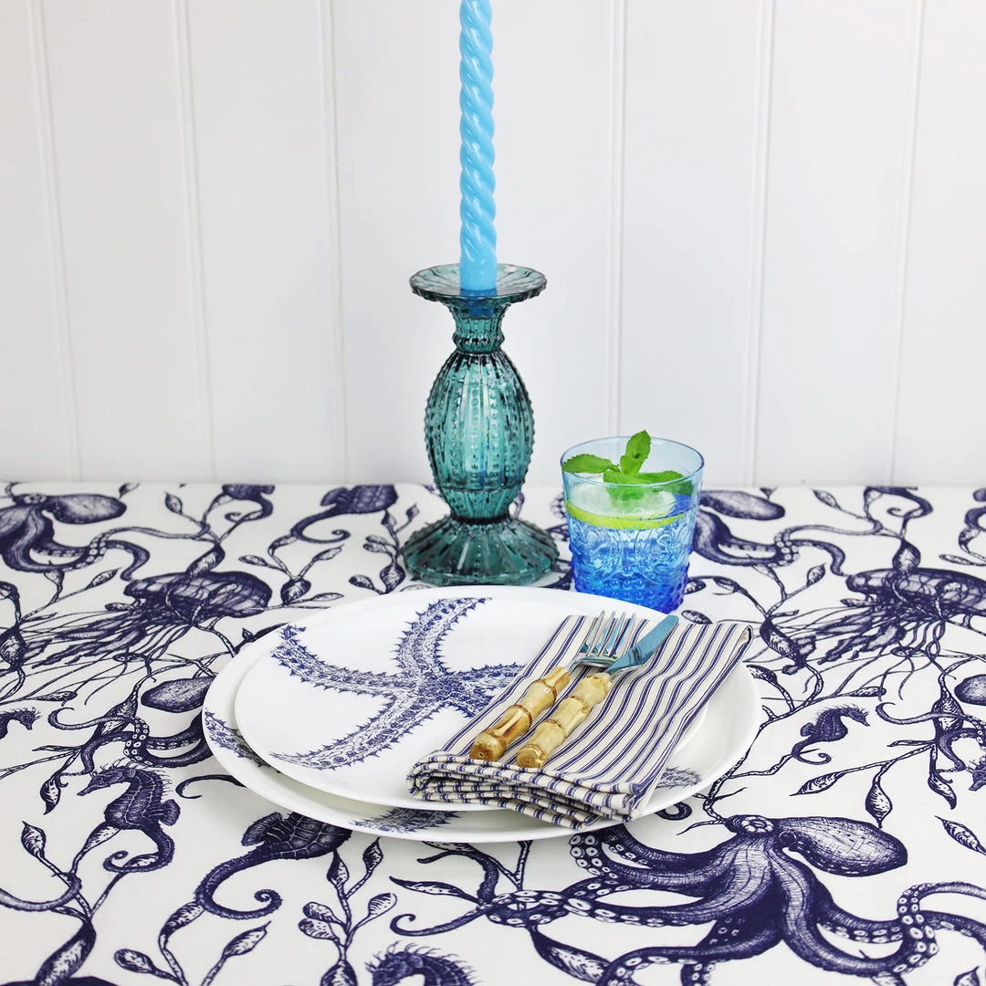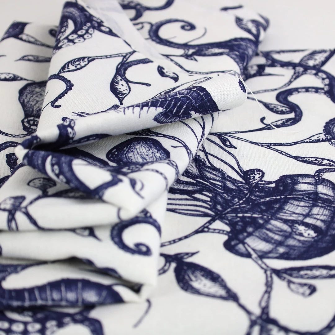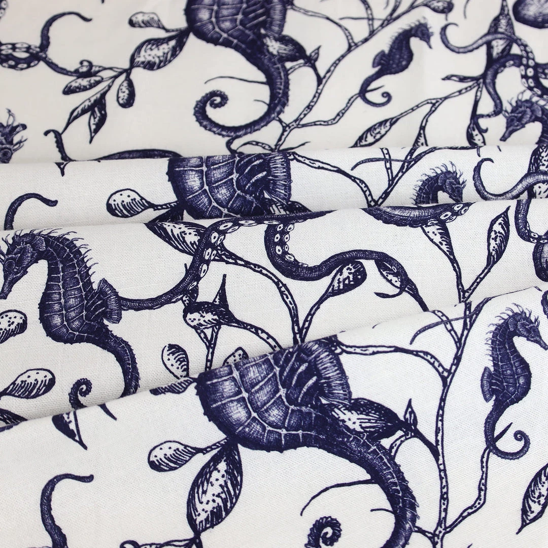 Our sea creatures and seaweed design is a beautiful, ethereal fabric that’s perfect for creating a unique coastal home. Octopus, seahorses, jellyfish and strands of seaweed are printed in our trademark Cream Cornwall deep navy. They float amongst each other on a background of natural linen and cotton to create a contemporary twist on traditional coastal styles.