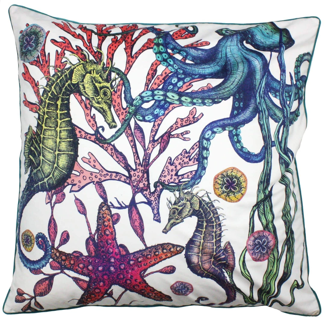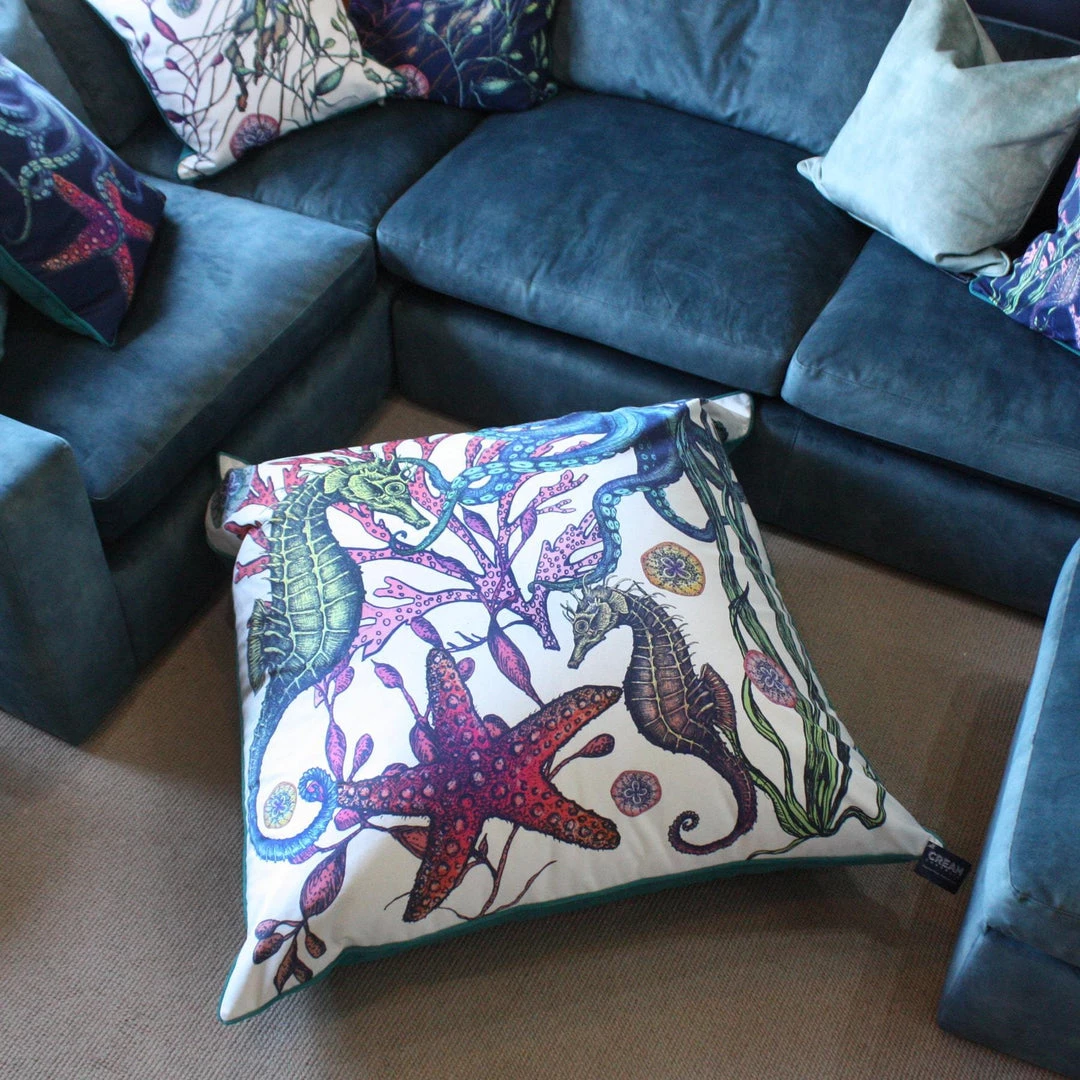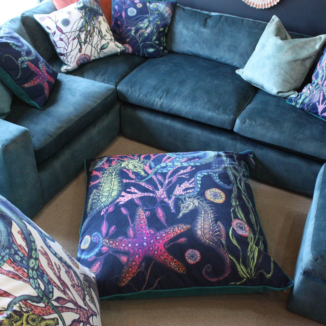 Our Reef floor cushion is one of the my favourite products that we’ve designed lately. The colours and detail are just amazing and it’ll give any room a wow factor! The colours really pop on the white velvet background and you’ll feel like you’re in an underwater wonderland.Â