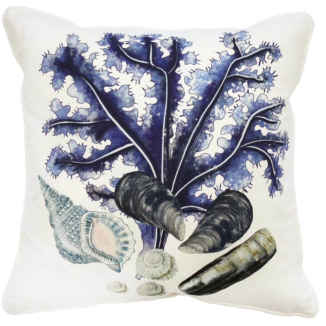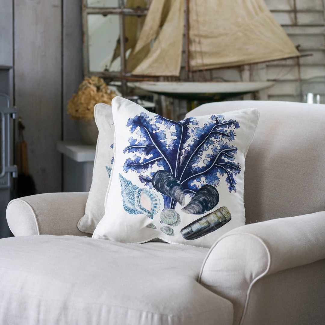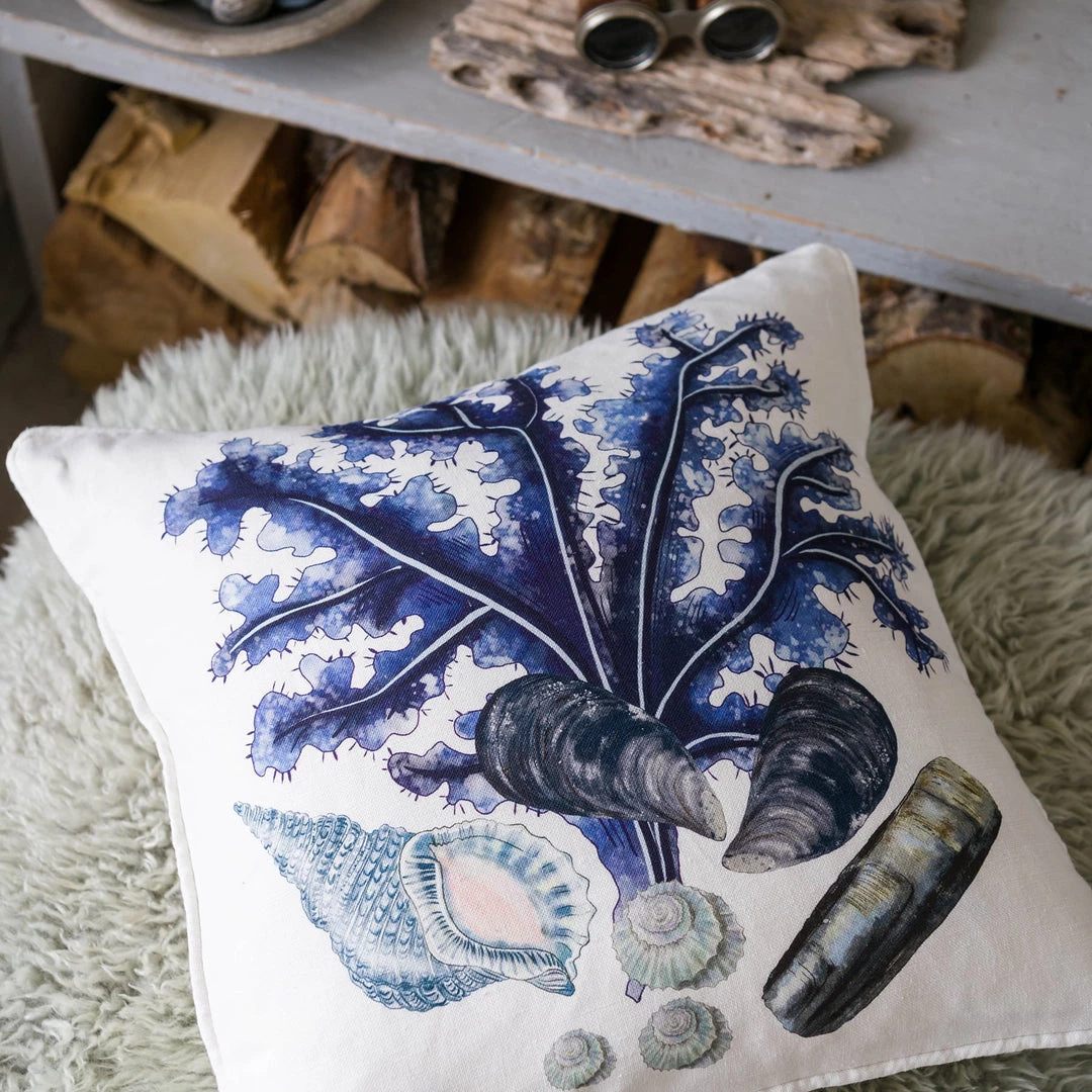 Razor clams, Mussel shells, Winkles and a Whelk shell sit against a beautiful fan of indigo seaweed. Shades of blue, from deep washy indigos, silver greys, through to sky blues with a pop of soft pink, this collection of shells reminds me of a Cornish summer. Choose from three base colours; ink blue, natural or off-white linen for this beautiful cushion.