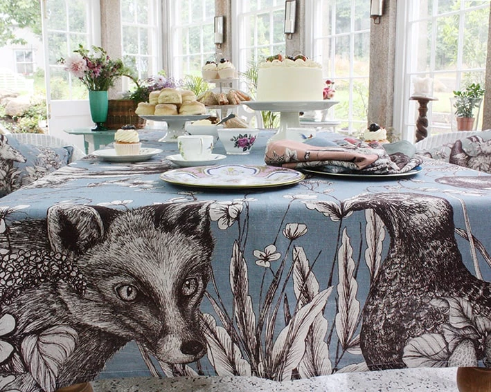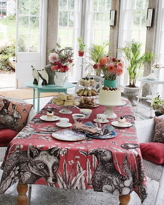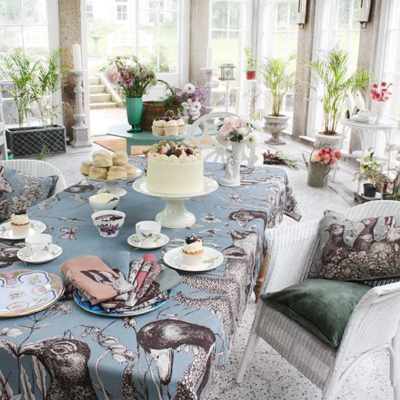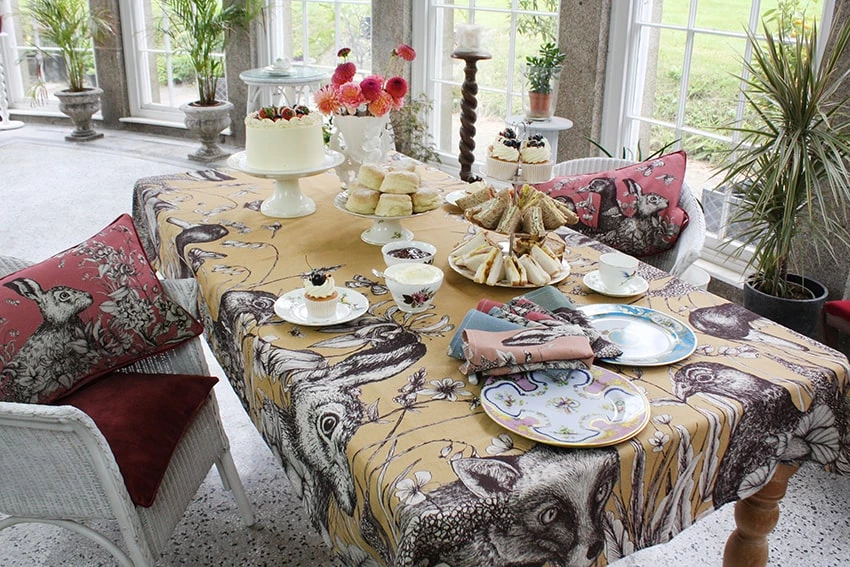 This Tablecloth has a border of country creatures, flora and fauna from our Trenwith range. The Hare, Fox, Pheasant and Grouse are surrounded by dragon flies, butterflies, hydrangeas, bluebells, honeysuckle and many other countryside favourites. It really is a work of art and you won’t want to take it off your table!